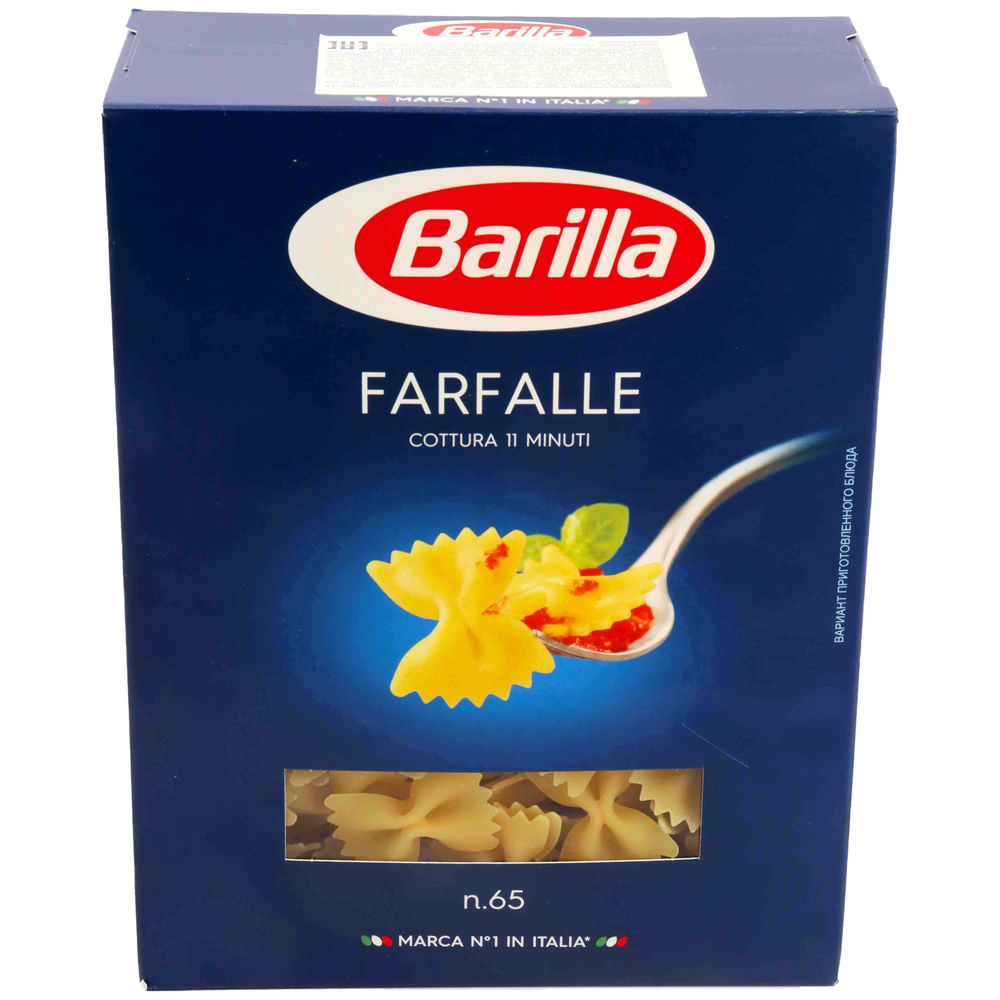 Группа А высший сорт Farfalle (Фарфалле). Масса нетто 400 г Пищевая ценность (средние значения) на 100 г ; энергетическая ценность – 359ккал/1521кДж; белки - 14r;