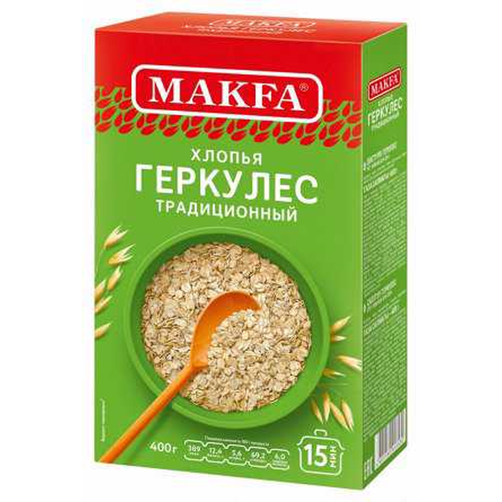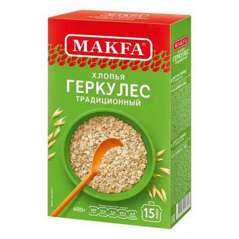 Хлопья Геркулес Макфа – это вкусные и полезные крупные овсяные хлопья, произведенные из натуральных ингредиентов. Они содержат много витаминов и минералов, а также белков и жиров. Хлопья Геркулес Макфа представлены в удобной упаковке по 12*400 г