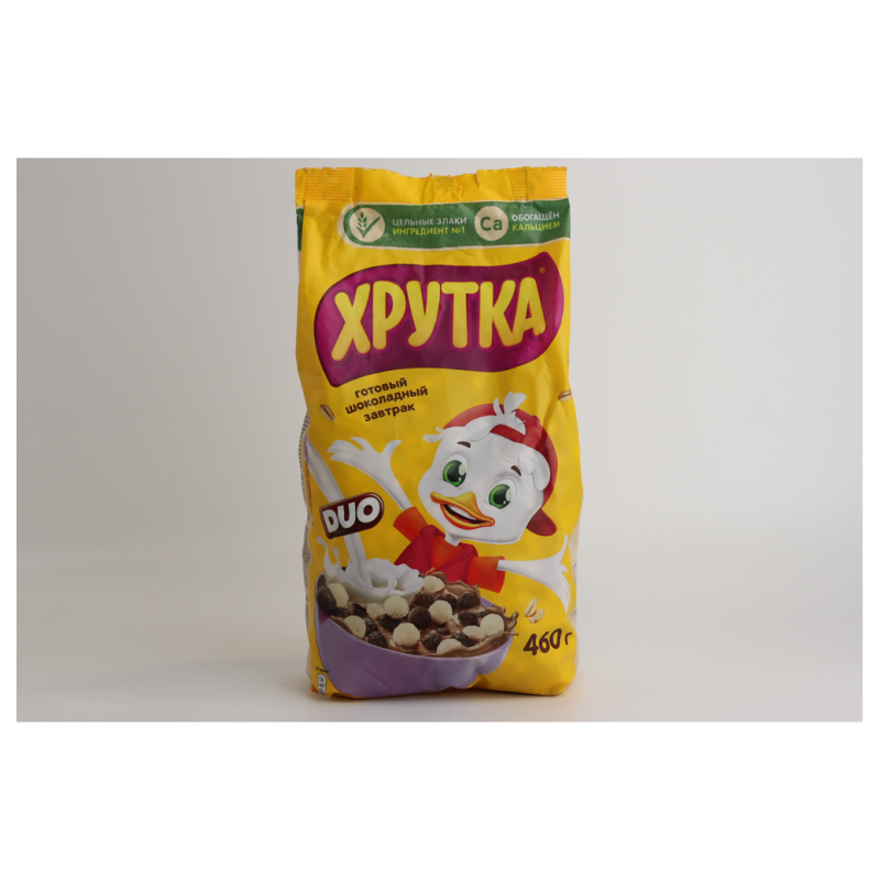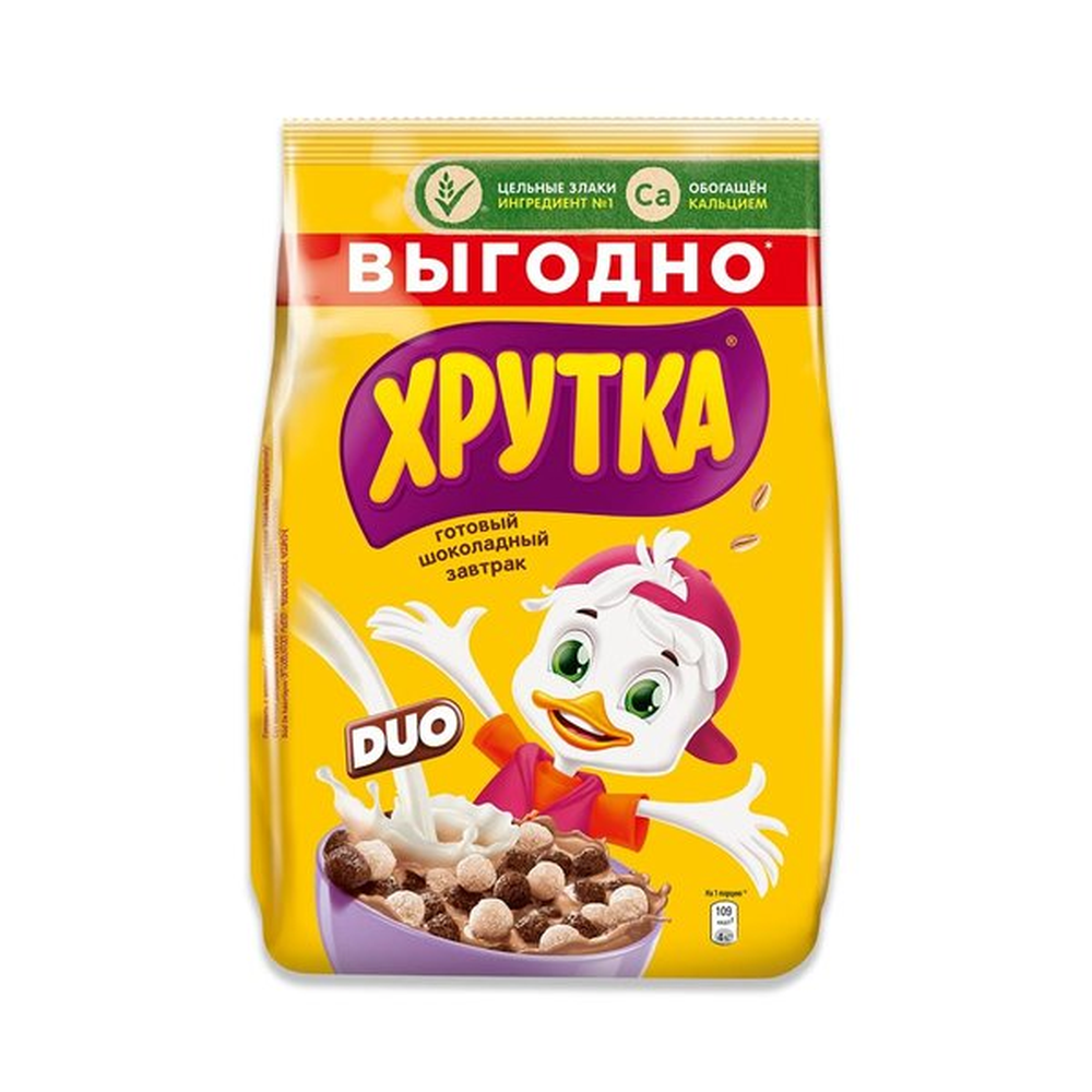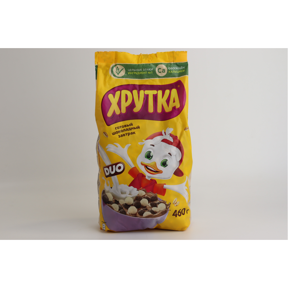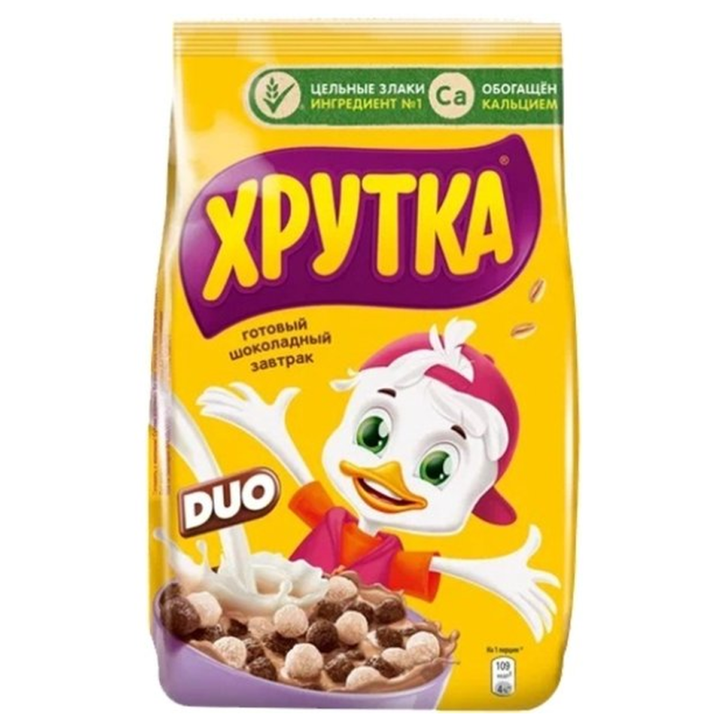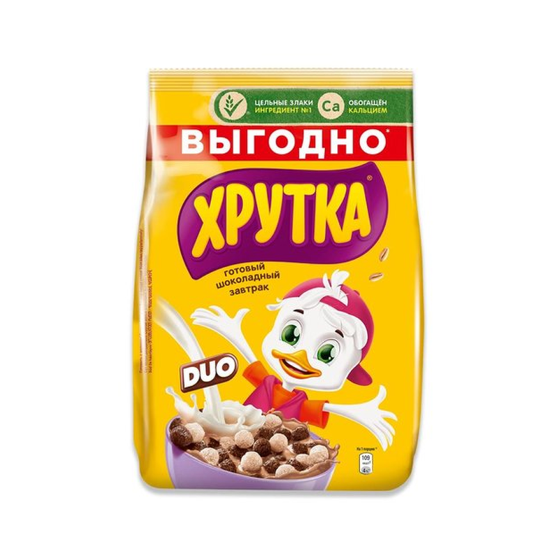Сухие завтраки Хрутка Duo Шоколадный представляют собой вкусные и полезные продукты для завтрака. Они состоят из муки пшеницы, шоколадного порошка, сахара, масла растительного происхождения и других ингредиентов. Они имеют приятный шоколадный вкус и приятную ароматную ароматику. Вес одной упаковки составляет 650 г амм.