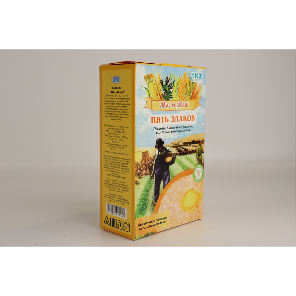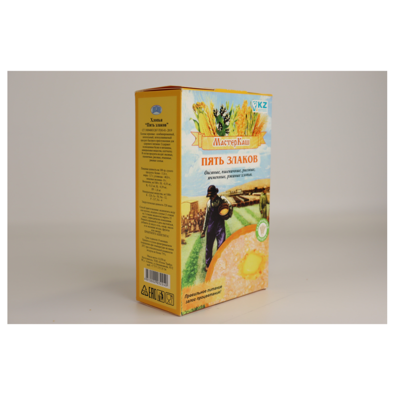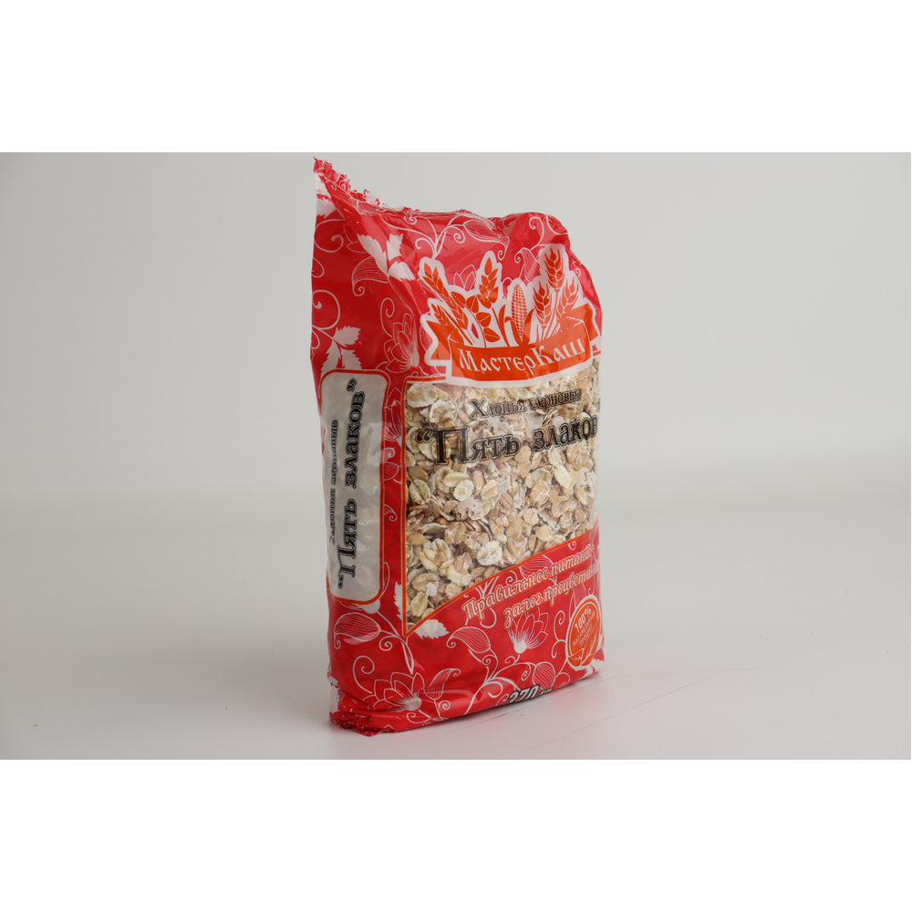 Хлопья для варки Мастеркаш Пять Злаков представляют собой качественное продукт из пяти злаков: пшеницы, гречки, овса, рожков и гречневой крупы. Они имеют приятный аромат и вкус, а также полезные питательные свойства. Упаковка весит 350 г амм.
