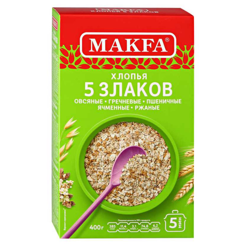 Хлопья 5 злаков Макфа – это полезный и вкусный продукт, приготовленный из пяти злаковых культур: пшеницы, овса, рожи, гречки и кукурузы. Они представлены в удобном для использования виде пакета по 400 г амм. Состав продукта включает в себя муку пшеничную, муку овсяную, муку кукурузную, муку гречневую, муку рожь и соль.