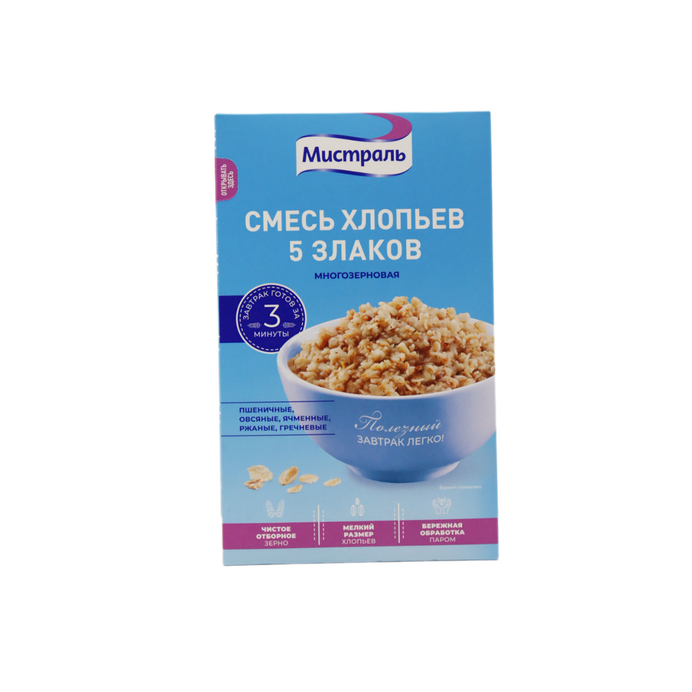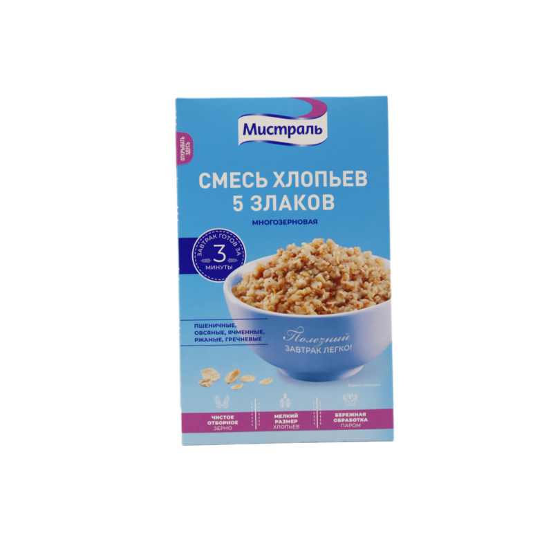 Хлопья Мистраль – это полезная смесь из 5 злаков: пшеницы, овса, рожи, гречки и кукурузы. Она представлена в удобной упаковке по 400 г амм. Хлопья Мистраль помогут поддерживать здоровое питание и придадут бодрости на весь день.