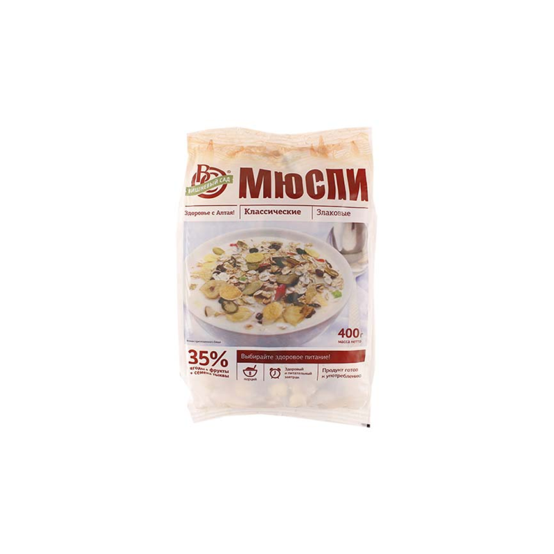 Мюсли Вишневый Сад Классич – это вкусные мюсли с вишневым джемом и классическим пирогом. Они приготовлены из натуральных ингредиентов, включая муку, сахар, масло растительное, вишню, корицу, молоко и яйца. Вес одной упаковки составляет 400 г амм.
