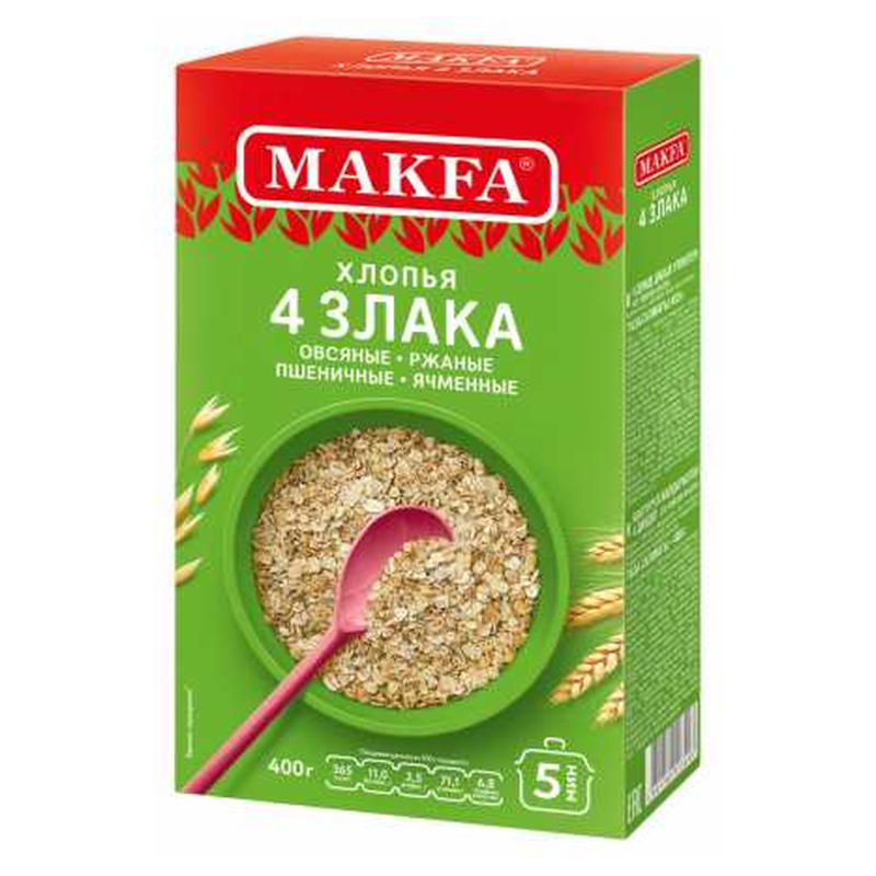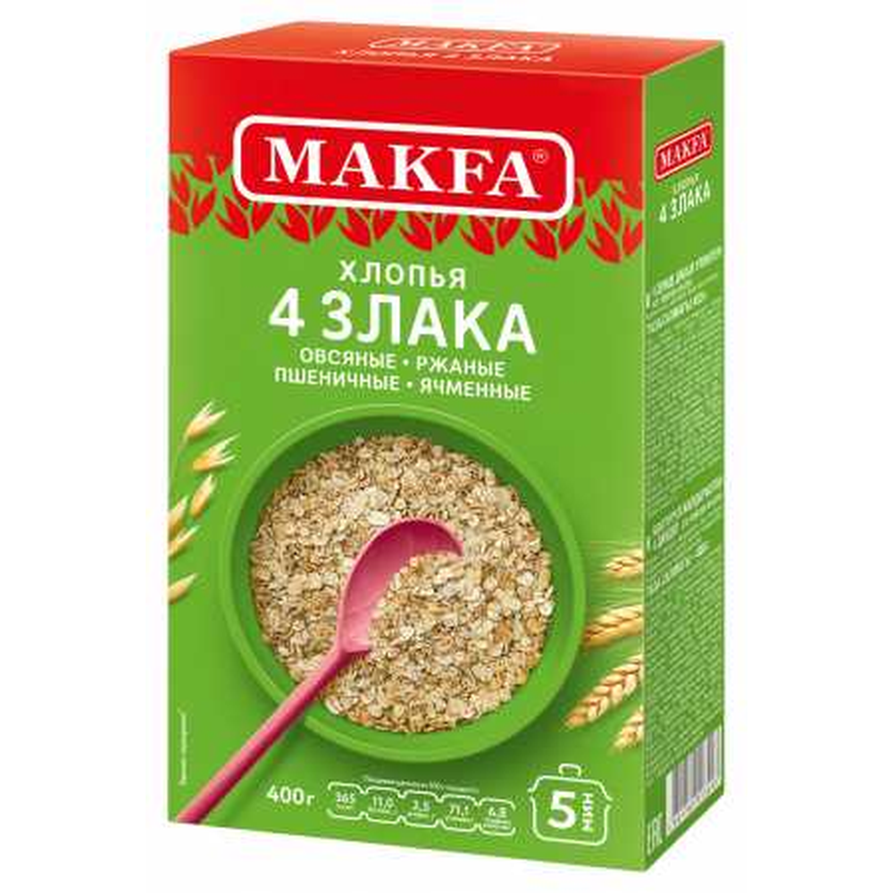 Хлопья 4 Злака Макфа – это продукт из четырех злаковых культур: пшеницы, овса, рожи и гречки. Они произведены из натуральных ингредиентов и имеют приятный вкус. Продукт представлен в удобной упаковке по 400 г амм.