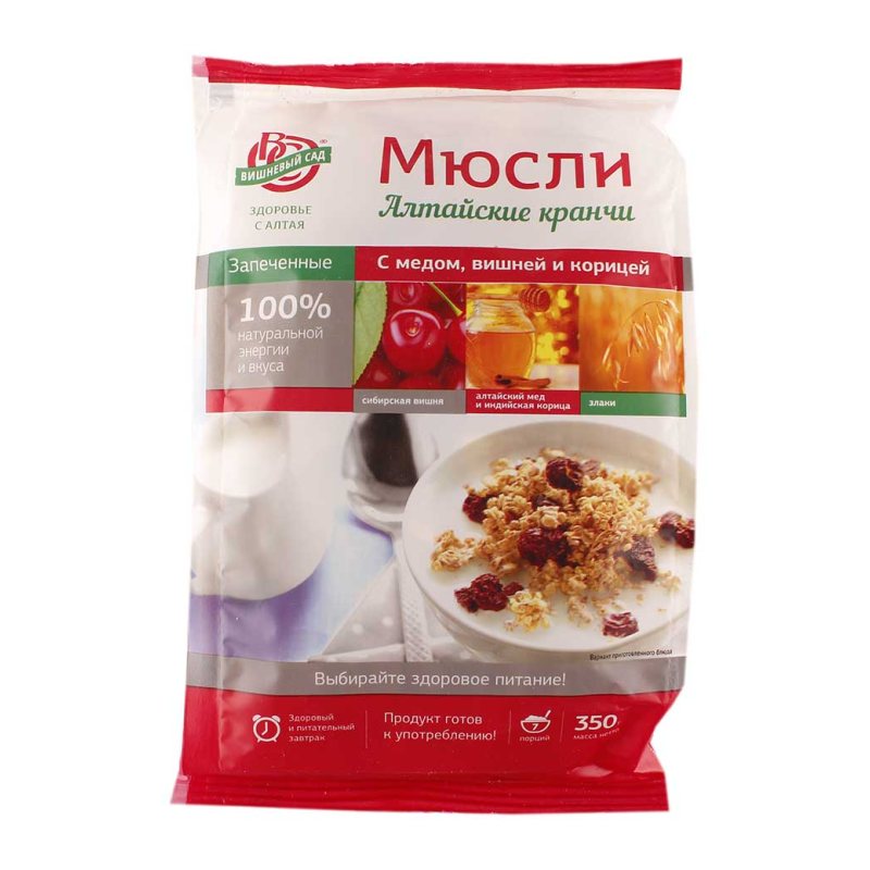 Мюсли Кранчи Вишневый Сад Мед Вишня/Корица – это вкусный и ароматный медовый продукт с добавлением вишни и корицы. Он содержит натуральные ингредиенты и не содержит консервантов. В состав входят мед, вишня, корица, вода, сахар, лимонная кислота.