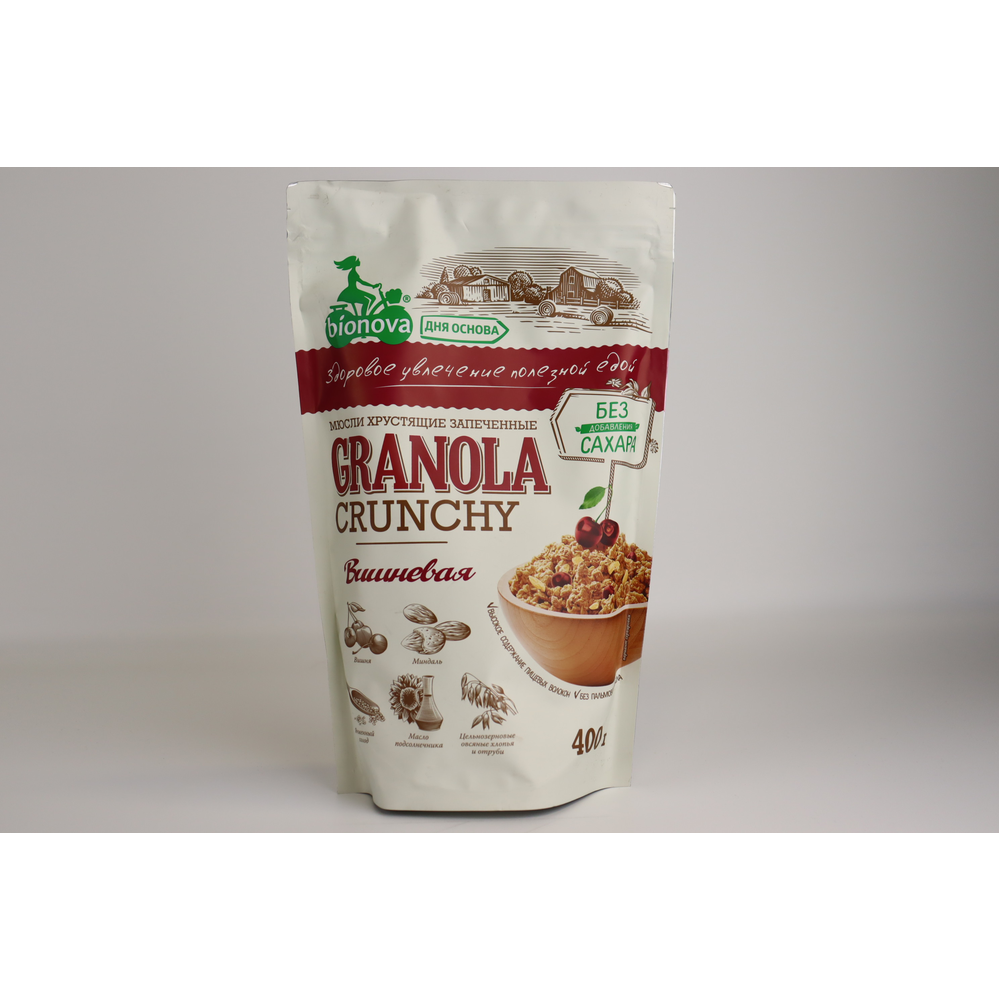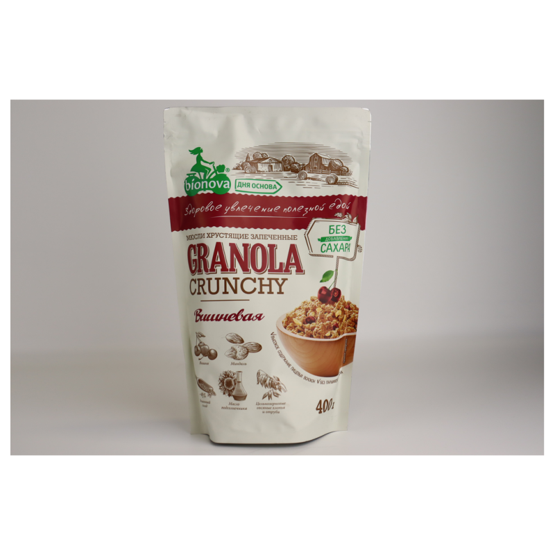 Мюсли Bionova Хрустящие Запеченные Вишневые - это вкусные и ароматные вишневые мюсли, приготовленные из натуральных ингредиентов. Они произведены из вишни, сахара, муки, масла растительного происхождения, протеина соевого и природных ароматизаторов. Они идеально подходят для завтрака или перекуса во время дня.