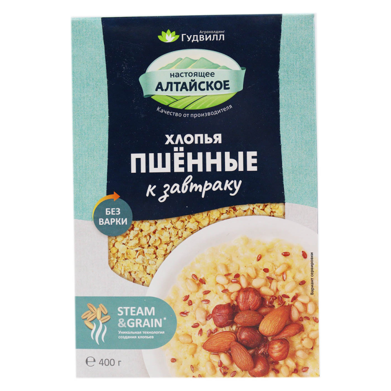 Хлопья Гудвилл пшенные нетребуют варки и идеально подходят для завтрака. Они состоят из пшеницы, просо, просо пшеницы, гречки, кукурузы, овса и просо гречневой муки. Вес пакета составляет 400 г амм.