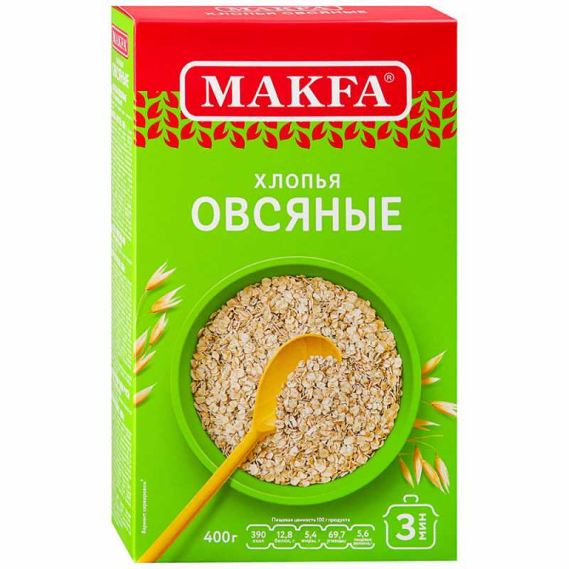 Хлопья Макфа овсяные, 400 г Способ приготовления: 1. В кипящую воду или молоко засыпать хлопья (на 1 часть хлопьев 2 части жидкости).2. Варить, помешивая в течение 3-х минут.3. Накрыть крышкой и настоять несколько минут.