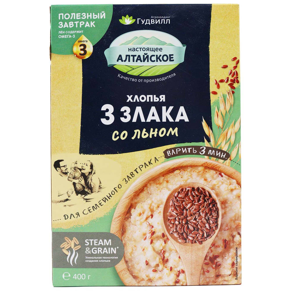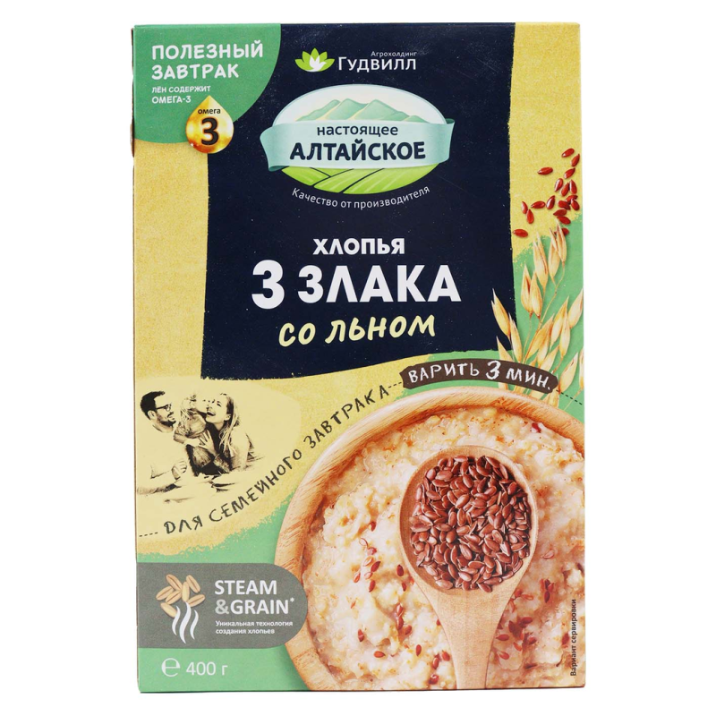 Хлопья Гудвилл 3 злака с льном – это продукт из трех злаков с добавлением льна. Время варки составляет 3-5 минут, а вес пакета составляет 400 г амм. Состав продукта включает в себя пшеницу, овсянку, гречку и льняное масло.
