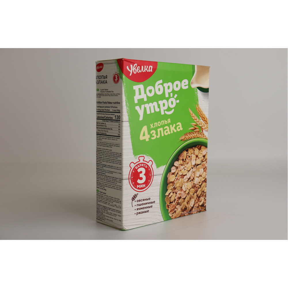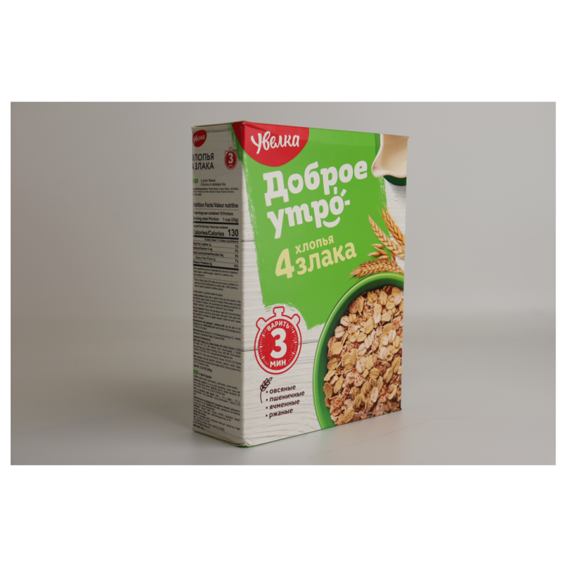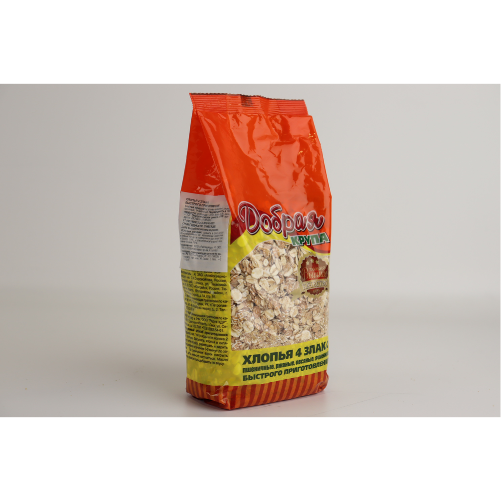 Хлопья 4 Злака Добрая Треб Варки – это вкусные и полезные злаковые хлопья из четырех злаков. Они произведены из натуральных ингредиентов, включая пшеницу, овес, гречку и рис. Они идеально подходят для завтрака и приготовлены в варке за несколько минут. Вес пакета составляет 400 г амм.