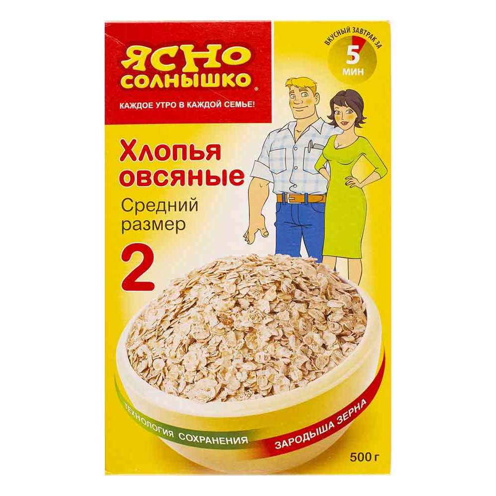 Овсяные хлопья, произведенные по технологии сохранения природных отрубей и зародыша зерна. Средние по величине овсяные хлопья, произведенные из резаной овсяной крупы. Время приготовления овсяных хлопьев №2 — всего 5 минут, при этом вы получите полезный завтрак для всей семьи. Содержащиеся в овсяных хлопьях №2 природные растворимые и нерастворимые пищевые волокна продлят чувство сытости, нормализуют пищеварение и помогут поддерживать в форме вашу прекрасную фигуру! Сохраненный зародыш зерна овса