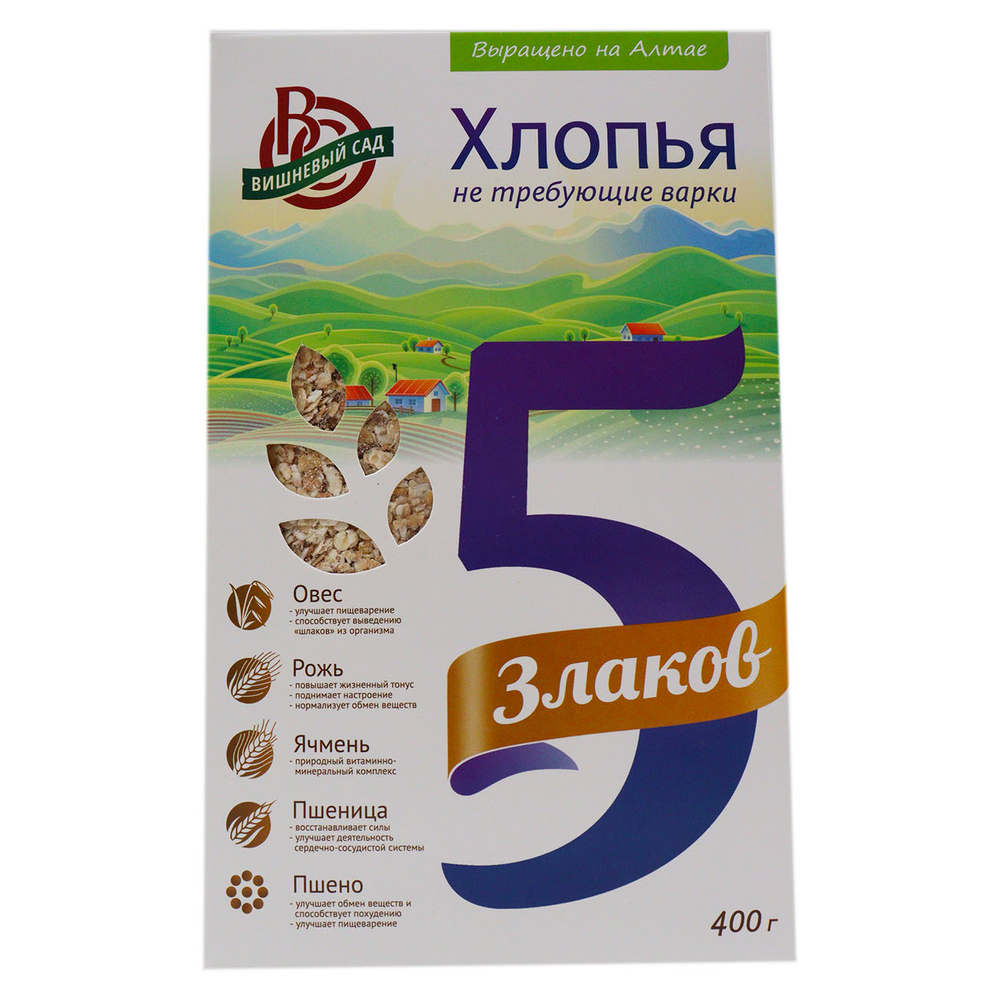 Хлопья Вишневый Сад 5 Злаков – это вкусные и полезные злаковые хлопья с добавлением вишни. Они содержат много витаминов и микроэлементов, а также полезные жирные кислоты. Состав хлопьев включает в себя пшеницу, овсянку, гречку, кукурузу, рис и вишню.