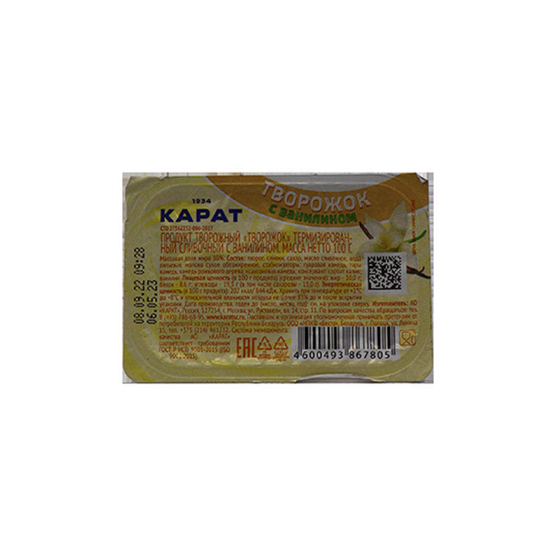 Продукт творожный «Карат» с ванилином, содержащий 10% жира, упакованный весом 100 г амм, представляет собой нежный и ароматный творожный продукт с добавлением ванилина, который придает ему сладкий вкус и аромат. Такой творожный продукт обычно употребляется как самостоятельное угощение или может использоваться в качестве начинки для выпечки, добавки в коктейли или приготовления десертов.