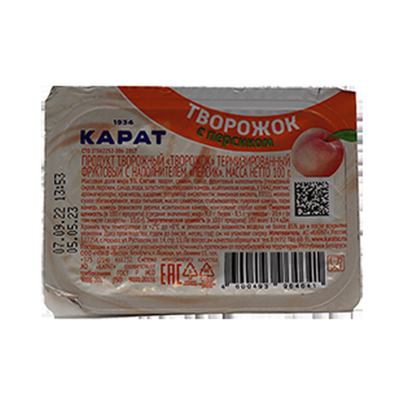 Продукт творожный 'Карат' с наполнителем персик, содержащий 9% жира и весом 100 г амм - это освежающее и вкусное лакомство для тех, кто ценит натуральные продукты. Нежный творожный продукт, обогащенный ароматным наполнителем из персика, создает неповторимый вкусовой опыт. Идеально подходит в качестве десерта или сладкого перекуса. Наслаждайтесь изысканным вкусом продукта творожного 'Карат' с наполнителем персик в каждом глотке.
