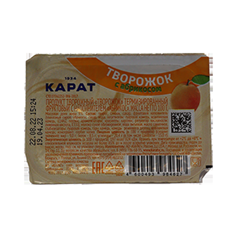 Творожный продукт «Карат» с наполнителем из абрикоса, содержащий 9% жира, весом 100 г амм - это вкусное и питательное лакомство, которое отлично подходит для завтрака или перекуса. Натуральный творог сочетается с ароматным абрикосовым наполнителем, создавая приятный вкус и текстуру. Упаковка весом 100 г амм удобна для употребления как дома, так и в дороге. Творожный продукт «Карат» с абрикосовым наполнителем - отличный выбор для тех, кто ценит вкусные и полезные молочные продукты.