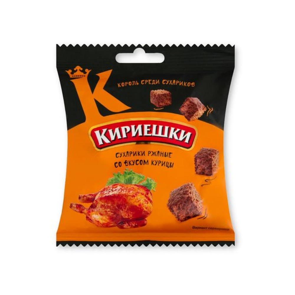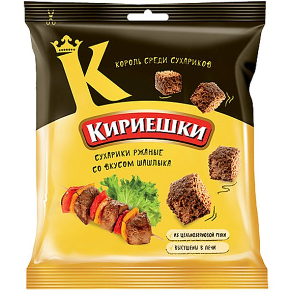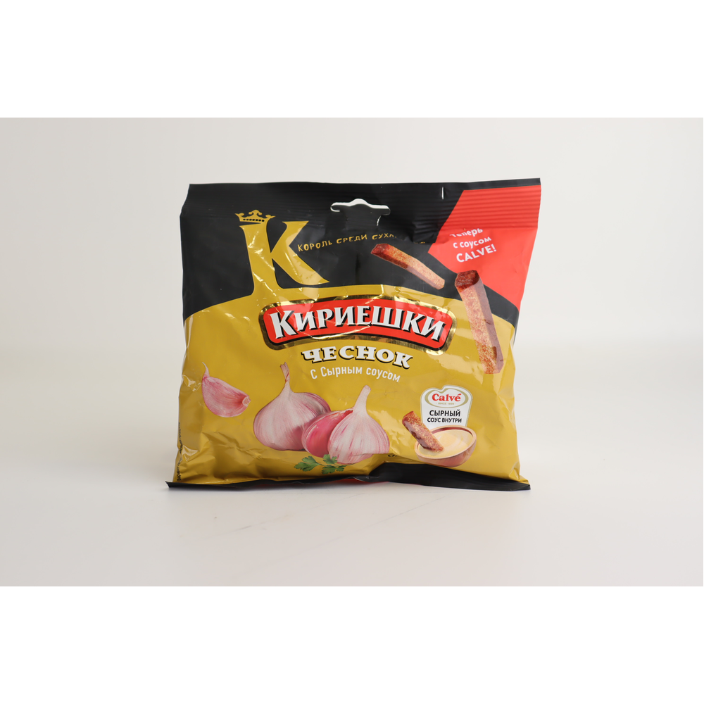Кириешки - это ржаные хлебцы с чесночно-сырным соусом, каждый весит 60 г амм. Они отличаются насыщенным вкусом ржаного хлеба, а также ароматом чеснока и сыра в соусе. Идеальное сочетание для легкой закуски или перекуса.