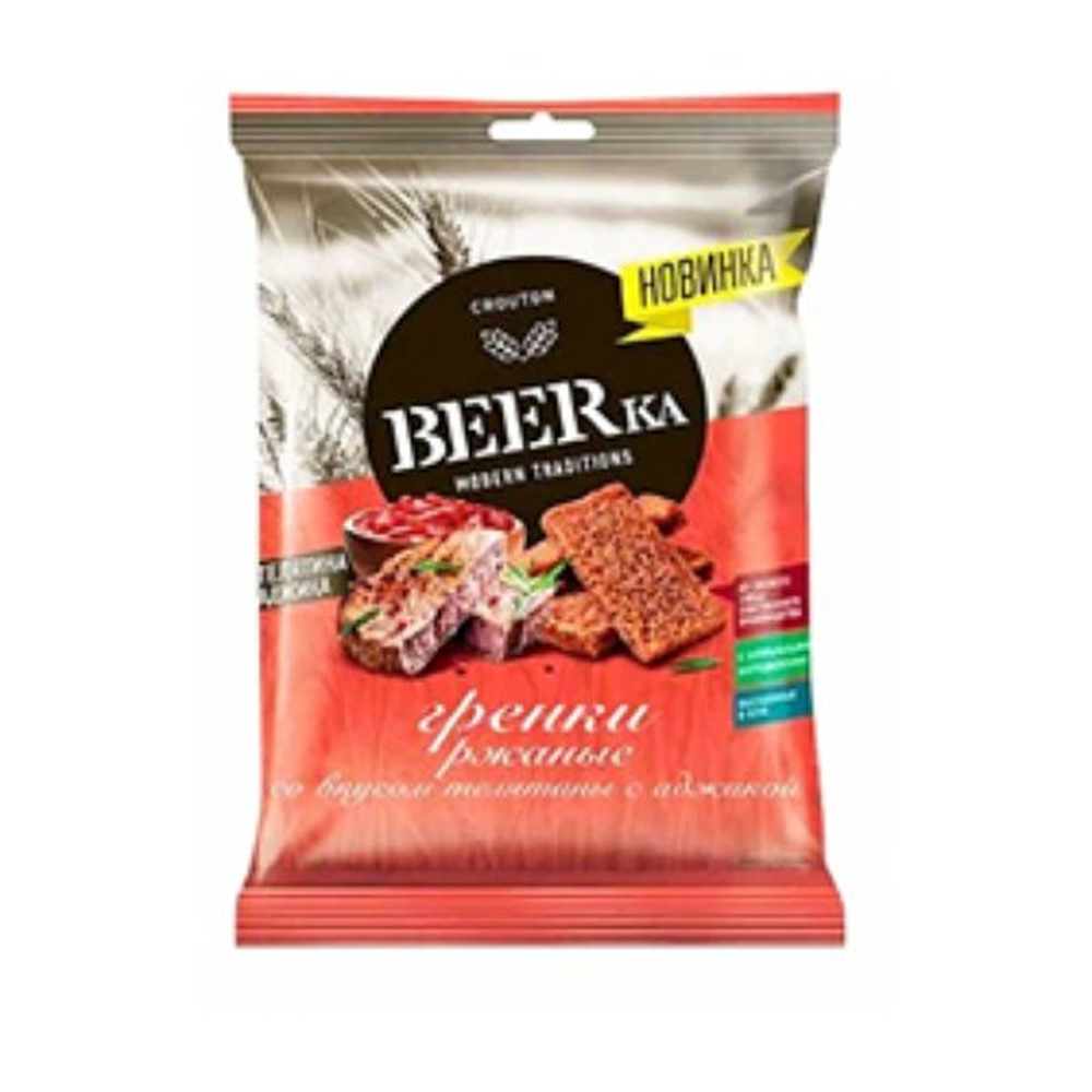 Попробуйте наши ржаные гренки Beerka с нежным телячьим мясом и остреньким аджикой! Идеальное сочетание хрустящего хлеба и сочного мяса, которое подарит вам незабываемый вкусовой опыт. Подойдут как перекус в офисе, так и закуска к пиву в компании друзей. Не упустите возможность попробовать этот вкусный и питательный продукт уже сегодня!