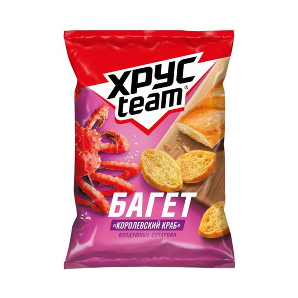 Сухарики Hrusteam Baget Королевский краб - это изысканная закуска, представляющая собой хрустящие кусочки багета, ароматизированные вкусом королевского краба. Этот аппетитный перекус прекрасно подходит для любителей морепродуктов и отлично сочетается с различными напитками. Упаковка весом 60 г амм обеспечивает удобство в потреблении и делает эту закуску отличным выбором для перекуса в любое время дня.