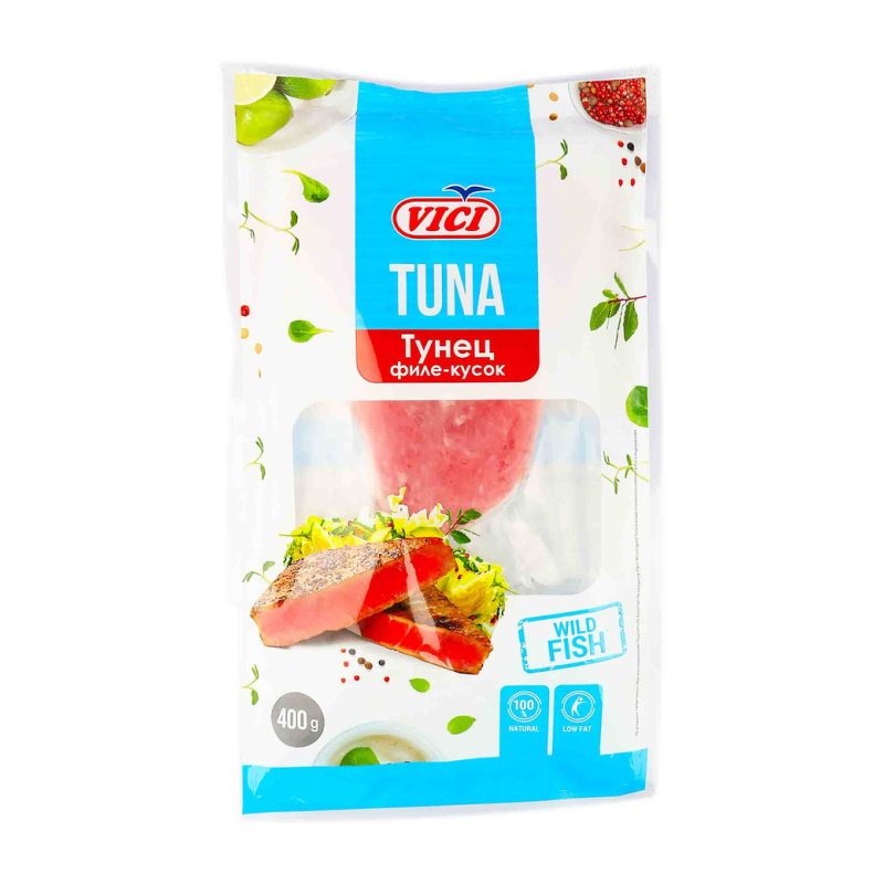 Тунец Vici филе-кусочки без кожи замороженный 400 г - это кусочки филе тунца без кожи, замороженные для сохранения свежести и качества. Упакованы в удобную упаковку весом 400 г амм, что делает их удобным выбором для приготовления различных блюд, таких как салаты, суши, пасты и многое другое.