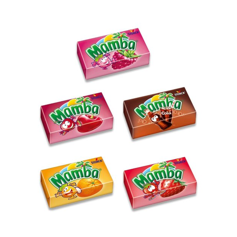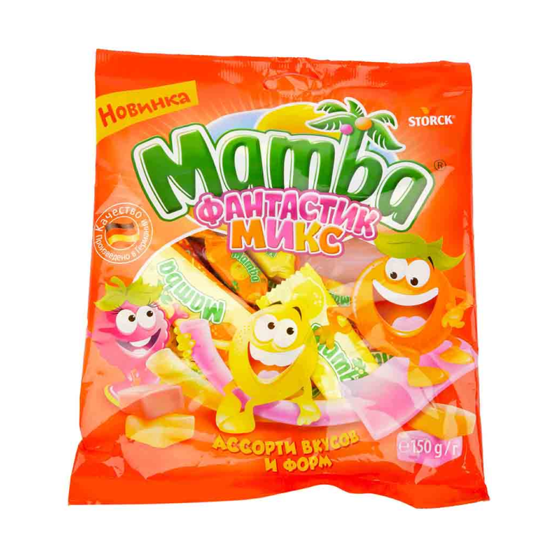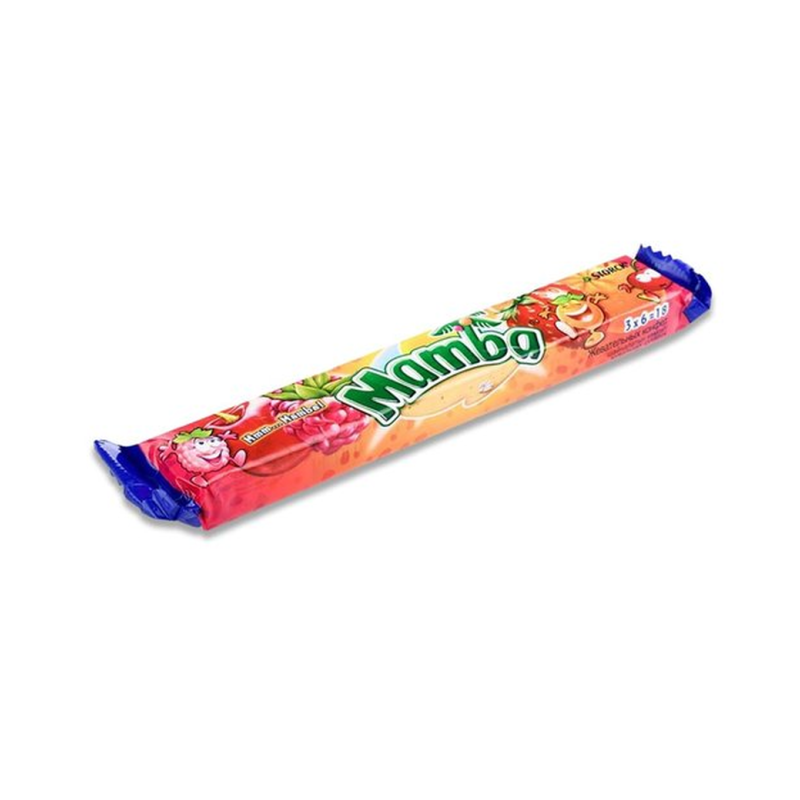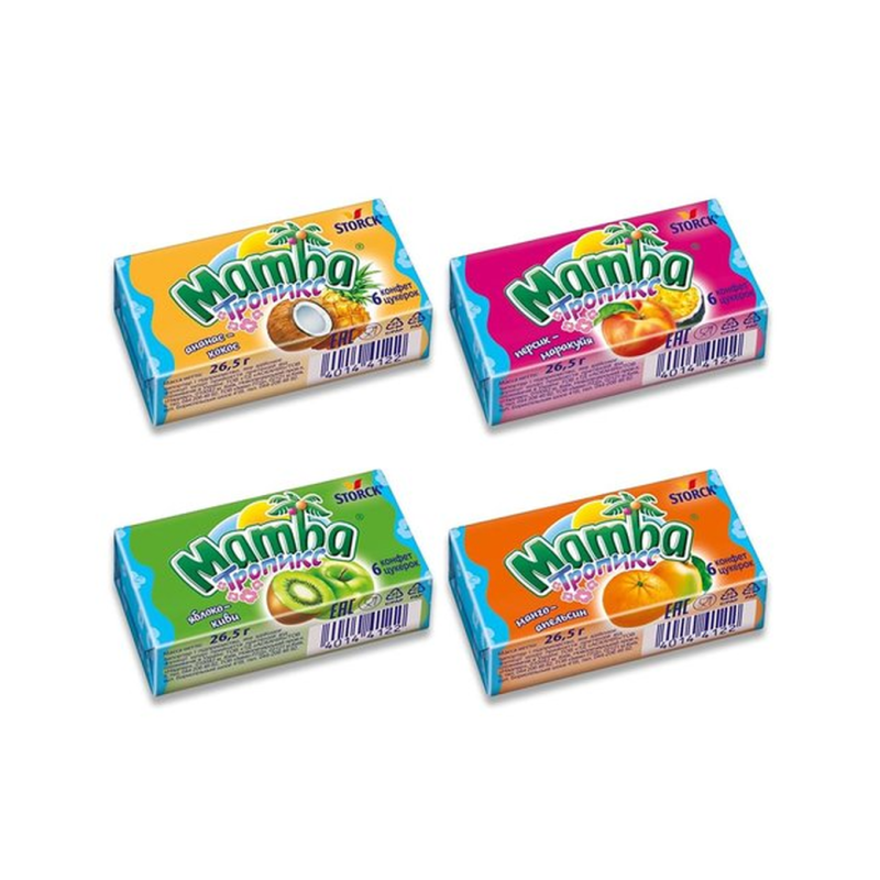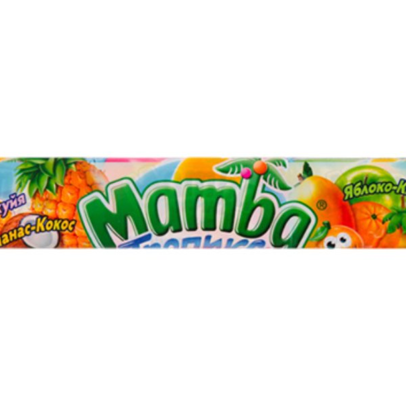 Жевательные конфеты Мамба с ароматным вкусом и приятной консистенцией. Состав конфет включает в себя сахар, молоко, масло пальмовое, пшеничную муку, ароматизаторы и крахмал. Вес конфет Мамба 79,5 г амма.