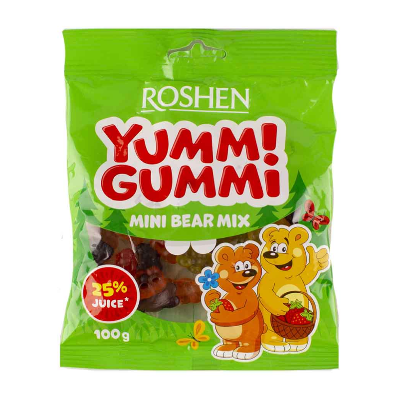 Конфеты Желейное Roshen Yummi Gummi Mini Bear Mix 70 г - это вкусные желейные конфеты с начинкой из маленьких мишек. Они изготовлены из натуральных ингредиентов, включая сахар, глюкозу, клейковину, кислоту лимонную и ароматизаторы. Они представляют собой идеальное сочетание сладости и кислотности.