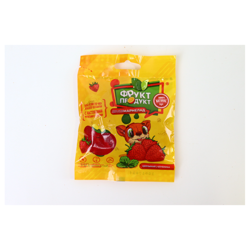 Жевательный мармелад Клубника с ароматом и вкусом натуральной клубники. Состав мармелада: сахар, глюкоза, клубничный сок, глицерин, кислота лимонная, ароматизатор. Вес одной упаковки 70 г