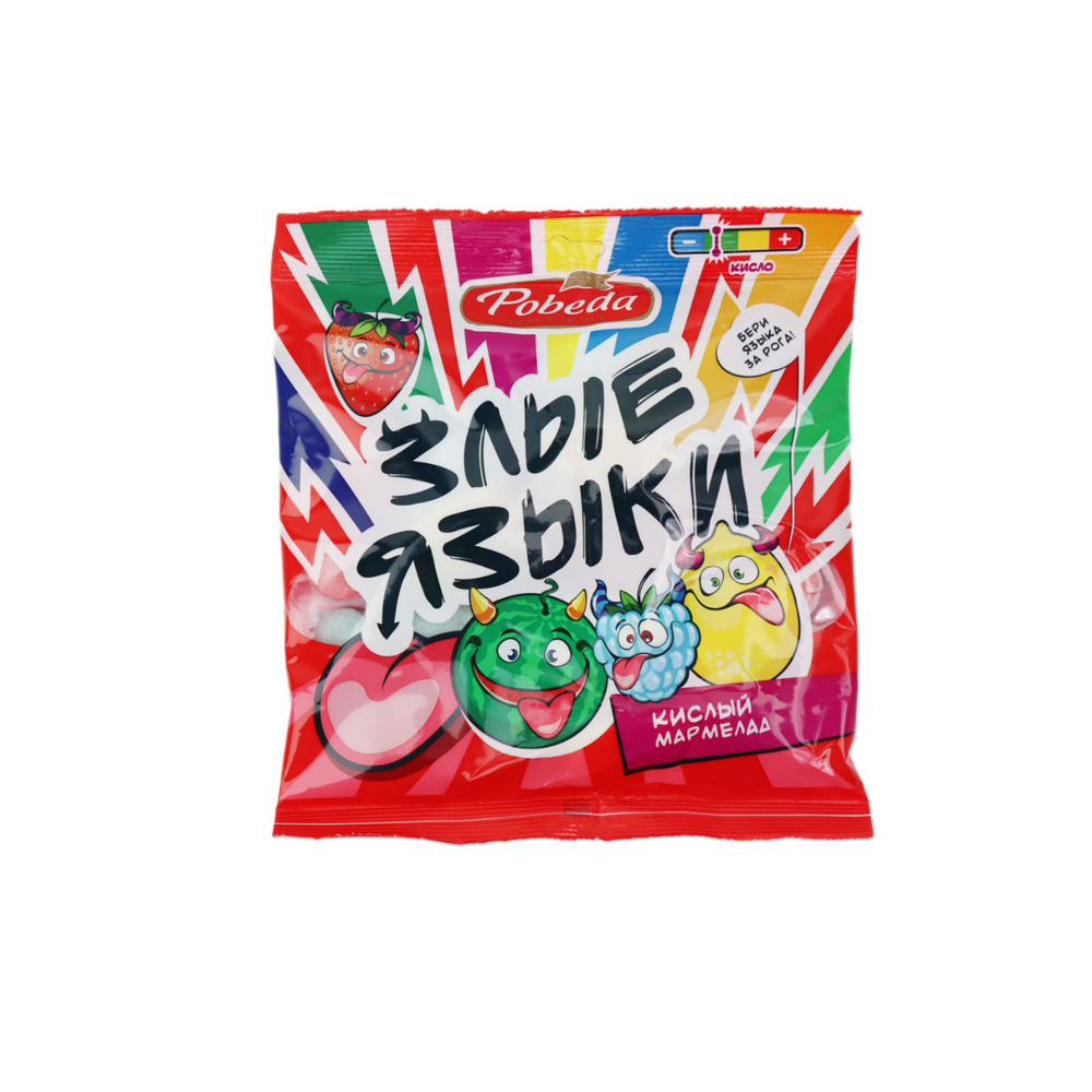 Мармелад Победа Злые Языки - это вкусный и ароматный десерт, состоящий из мягкой мармеладной массы и крошек из печенья. Состав продукта включает в себя сахар, молоко, масло растительное, пшеничную муку, кукурузный крахмал, печенье, ароматизаторы и красители. Вес одной упаковки составляет 150 г амм.