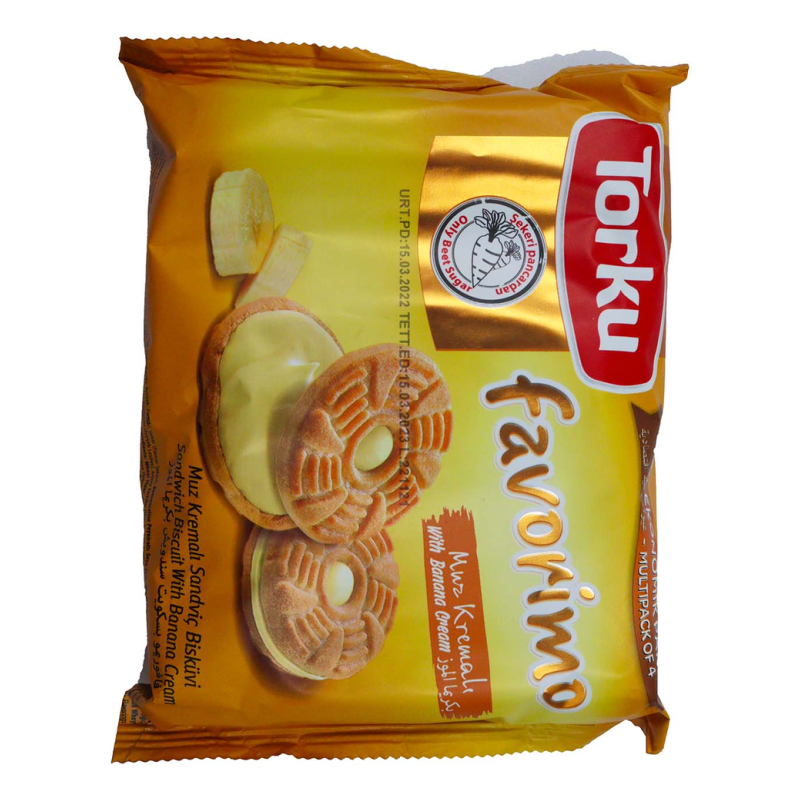 Печенье Torku Favorimo с сэндвичем и банановым кремом – это вкусное и полезное блюдо для завтрака. Оно состоит из двух крошечных печениц с банановым кремом внутри. Состав печенья включает в себя пшеницу, масло пальмовое, сахар, банановый пюре, молоко и другие ингредиенты. Вес печенья составляет 244 г амма.