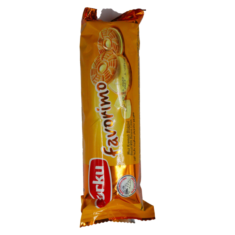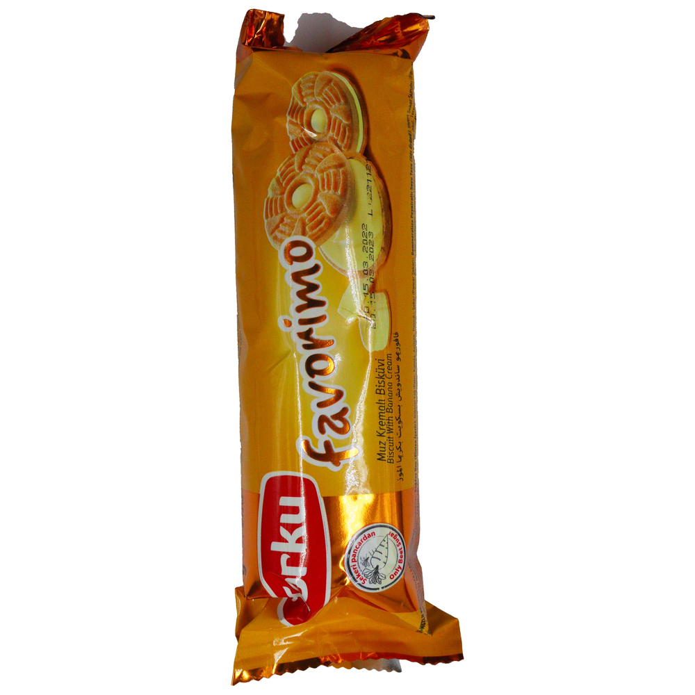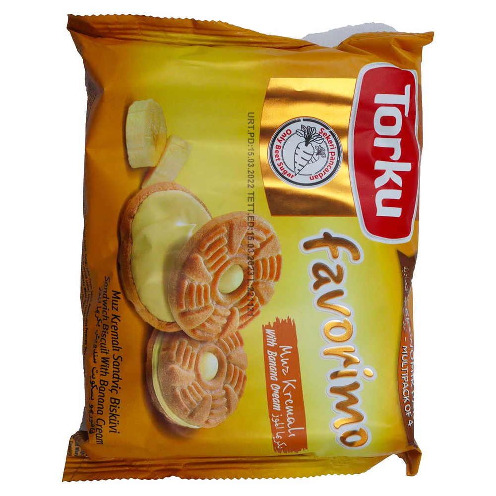 Печенье «Сэндвич Favorimo» с кремом вкуса банана поставляется в упаковке, содержащей 4 упаковки по 24 печенья весом 61 г амм каждая. Каждое печенье имеет консистенцию сэндвича, с кремовой начинкой, которая придает вкус банана.