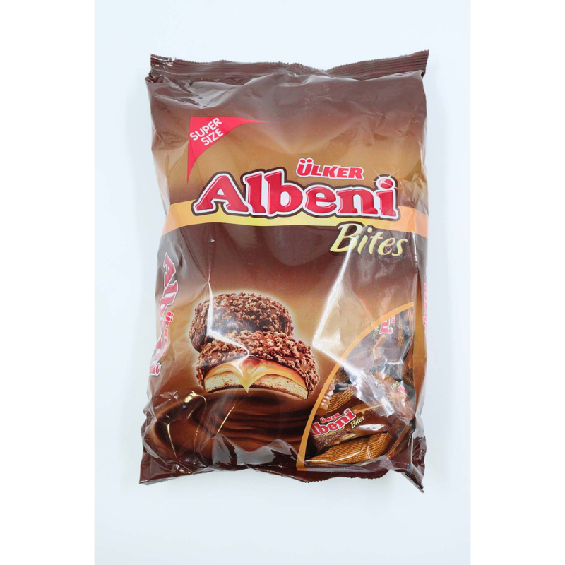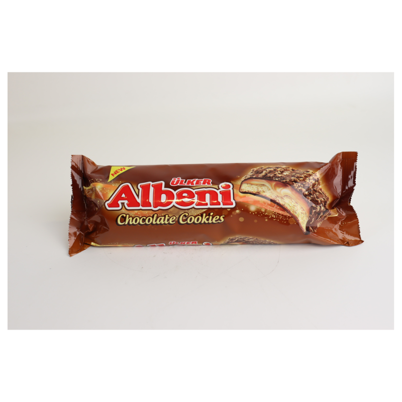 Печенье Albeni с карамелью в молочно-шоколадном вкусе и крошками печенья в комплекте. Состав печенья включает в себя муку пшеничную, сахар, масло растительное, какао, крошки печенья, карамель, молочный шоколад. Вес печенья составляет 170 г амм.