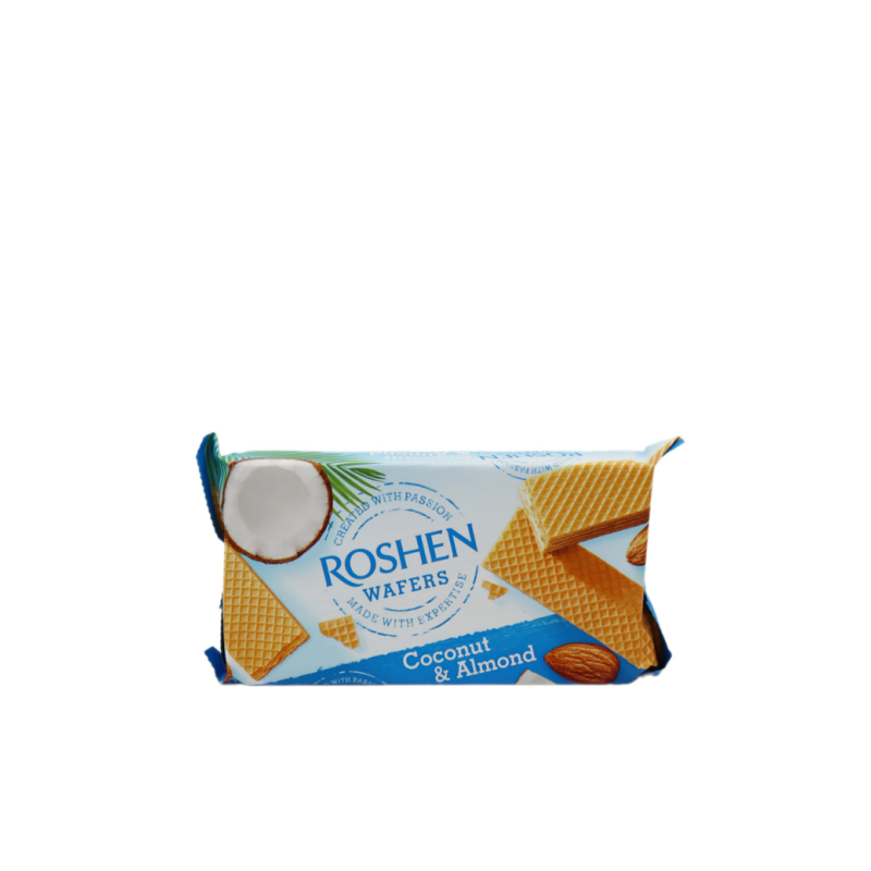 Вафли Roshen Wafers с кокосом и миндалем в упаковке весом 216 г амм содержат 16 штук. Эти вафли известны своим нежным вкусом и хрустящей текстурой, а комбинация кокоса и миндаля придает им особый аромат и уникальный вкус.