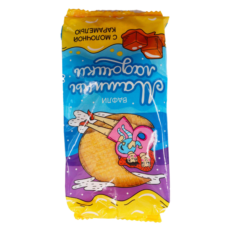 Вафли Мамины Ладошки с вареной сгущенкой – это вкусный и ароматный десерт для всей семьи. Они приготовлены из натуральных ингредиентов: муки, сахара, сливочного масла, вареной сгущенки и других природных компонентов. Вес одной упаковки составляет 225 г амм.