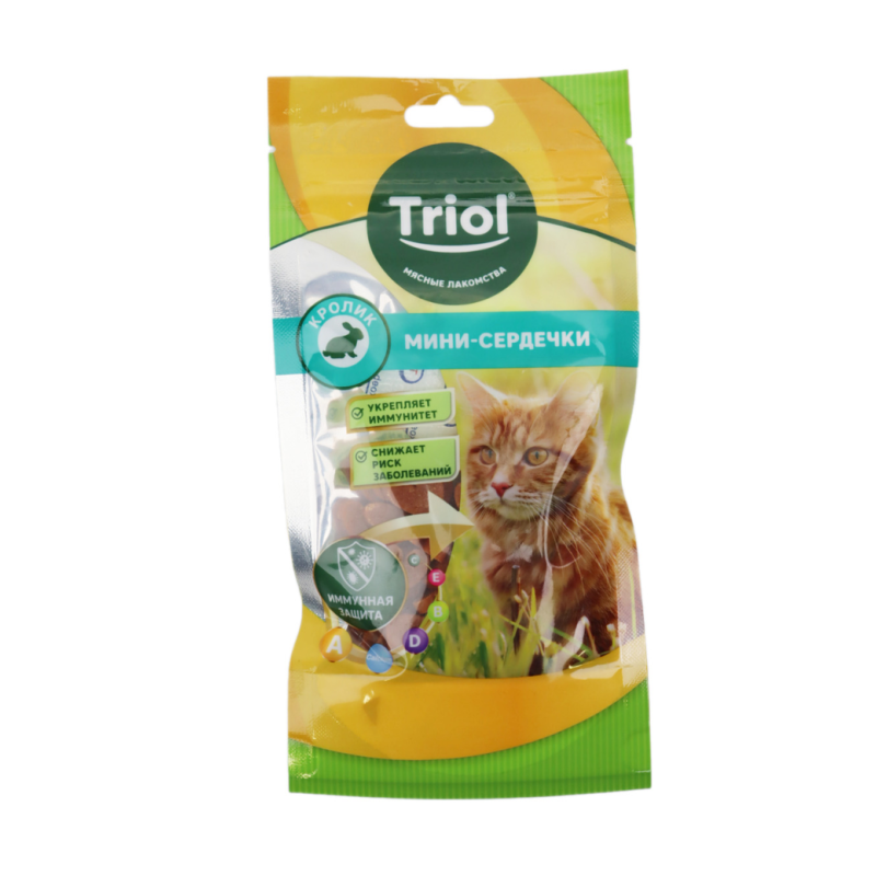 Нежные мини сердечки из кролика - идеальное лакомство для вашей кошки! Сбалансированный вкус и питательные свойства делают их отличным угощением для вашего питомца. Подарите вашей кошке незабываемый вкус и радость каждый день. Попробуйте добавить их в ее рацион или использовать как поощрение во время обучения. Покупайте лакомства для кошек от Triol и делайте вашего питомца счастливым!