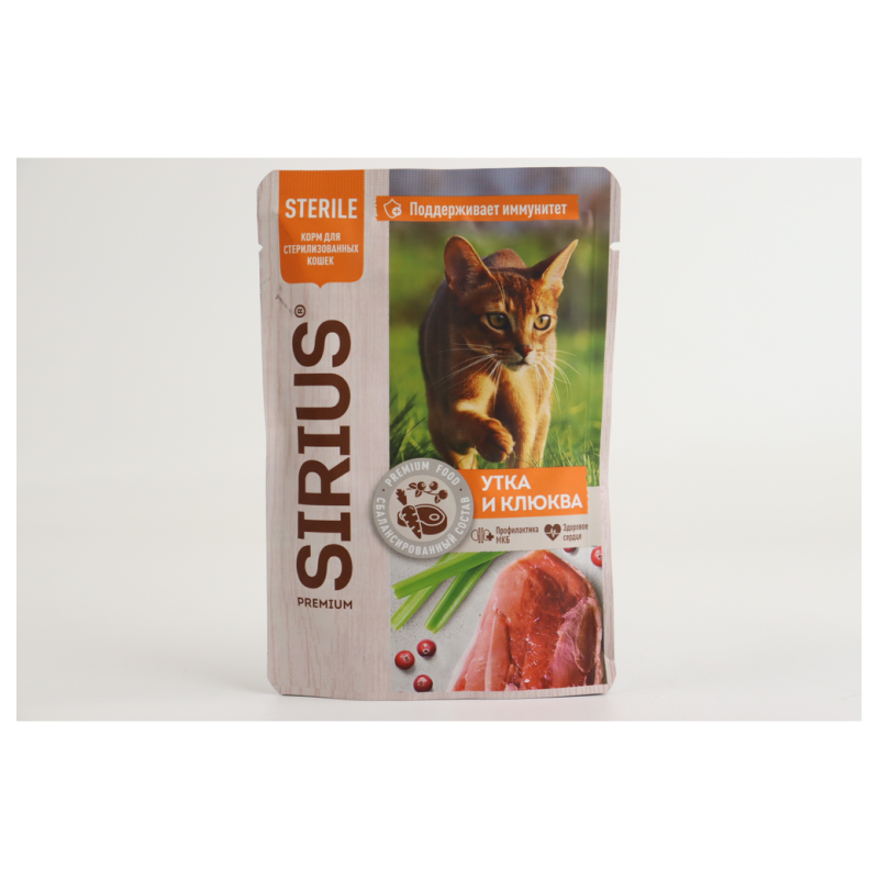 Корм для стерилизованных кошек Сириус с уткой и клубникой весит 1,5 кг Этот корм разработан специально для кошек, которые прошли стерилизацию, и содержит оптимальное сочетание питательных веществ для поддержания здоровья и веса после операции. Он состоит из свежей утки с высоким содержанием белка, а также клубники, богатой антиоксидантами и витаминами.