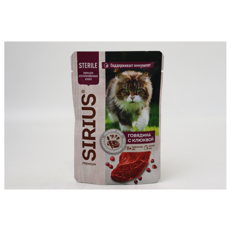 Консервированный корм Sirius для стерилизованных кошек с говядиной и клюквой - это идеальное лакомство для вашего питомца. Сбалансированный состав обеспечивает необходимое питание и поддерживает здоровье вашего пушистого друга. Попробуйте дать вашей кошке это вкусное блюдо как основной рацион или как дополнение к сухому корму. Позвольте вашему питомцу насладиться нежным мясом говядины и свежестью клюквы, чтобы он чувствовал себя счастливым и здоровым. Действуйте сегодня и порадуйте своего питомца вкусным угощением от Sirius!