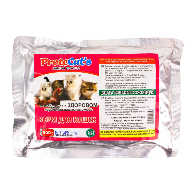 Состав : мясо и субпродукты (в том числе курица), продукты животного происхождения, пшеничная мука, загустители, аминокислоты (в том числе таурин), минеральные вещества, витамины, свекловичный жом, сахара, натуральные красители.
