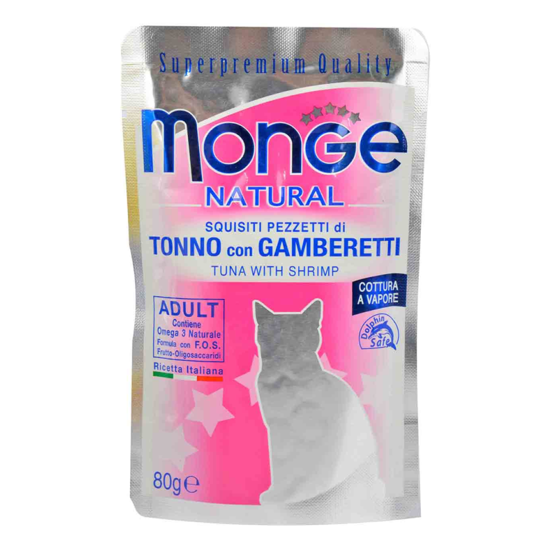 Лакомство Monge Кусочки Для Кошек Тунец/Креветки в Желе 80 г - идеальное угощение для кошек, объединяющее нежный вкус тунца и изысканные креветки. Эти лакомства богаты важными питательными веществами и находятся в аппетитном желе, что делает их влажными и аппетитными. Порадуйте вашего пушистого друга этим вкусным и полезным лакомством. Состав: тунец, креветки, желе.