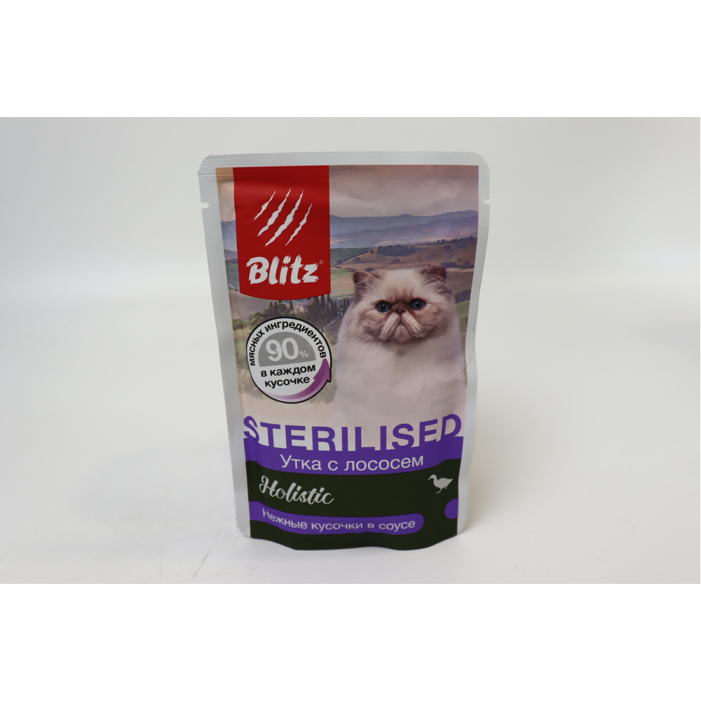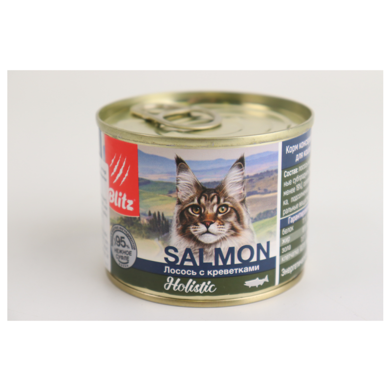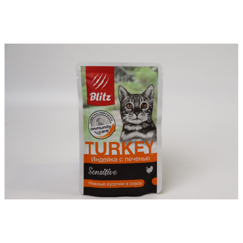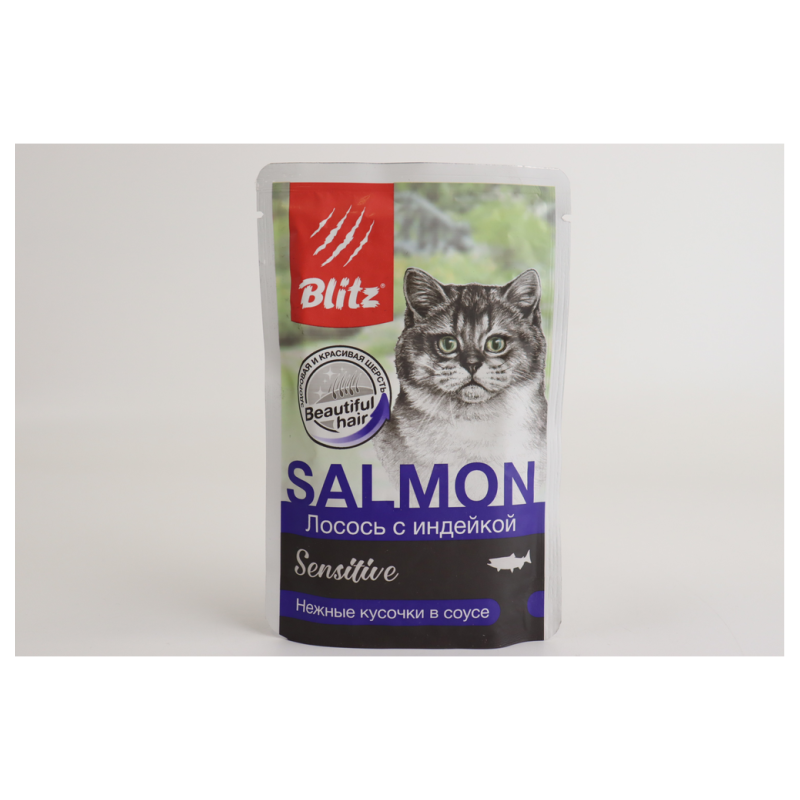 Корм Blitz консервирован для кошек весом 85 г амм. Он содержит в себе лосось и индейку, которые находятся в соусе. Состав корма включает в себя высококачественные ингредиенты, которые обеспечивают полноценное питание и поддерживают здоровье кошки.
