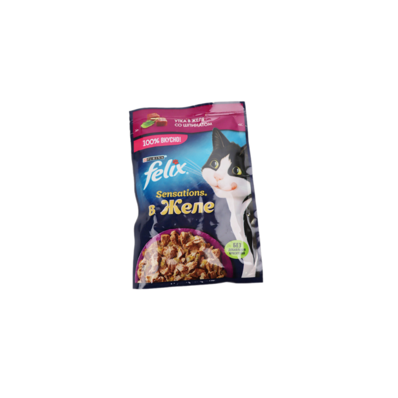 Корм для кошек Felix Sensations в желе с уткой и шпинатом, упаковка 75 г амм, представляет собой изысканное и сбалансированное питание, которое обязательно понравится вашему питомцу. Сочная утка и ароматный шпинат обеспечивают не только неповторимый вкус, но и богатство витаминов и минералов для здоровья вашей кошки. Этот корм в желе - отличный выбор для ежедневного кормления, чтобы удовлетворить потребности вашего питомца во вкусной и питательной пище.