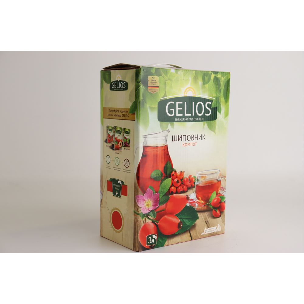 Компот шиповник Gelios 3 л Bag-in-Box - это, вероятно, упаковка компота из шиповника от Gelios объемом 3 л итра в технологичной упаковке Bag-in-Box. Компот из шиповника обычно приготавливается из ягод шиповника с добавлением сахара и воды. Упаковка Bag-in-Box обеспечивает удобство использования и хранения, а также сохраняет свежесть продукта в течение длительного времени после вскрытия.