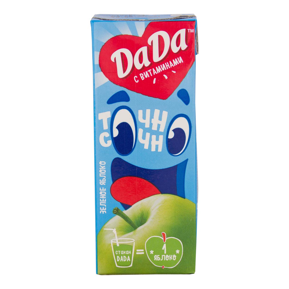 Освежающий зеленое яблоко сок Dada - идеальный выбор для тех, кто ценит натуральные ингредиенты и яркий вкус. Этот сок изготовлен из спелых зеленых яблок, что придает ему освежающий и слегка кисловатый вкус. Сочный и полезный напиток, который подойдет как для утреннего завтрака, так и для освежающего перерыва в течение дня. Попробуйте добавить этот сок в коктейли или использовать его в кулинарии для придания блюдам особенного вкуса. Попробуйте сок Dada зеленое яблоко и ощутите вкус свежести!