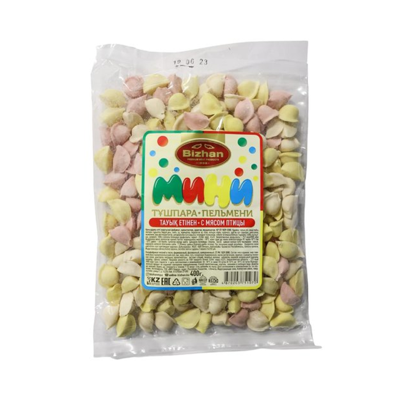 Вареники «Бижан» мини с творогом (400 г): Эти вареники из тонкого теста обычно наполнены творогом и приправлены по желанию. Их состав может включать муку, творог, соль, воду, и другие возможные ингредиенты в соответствии с рецептурой.