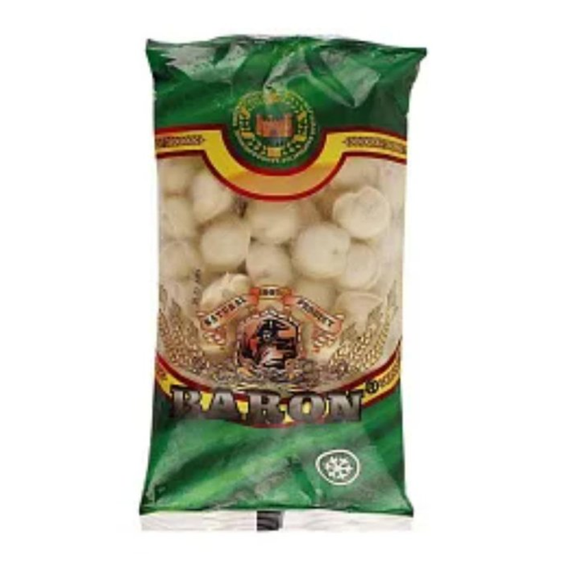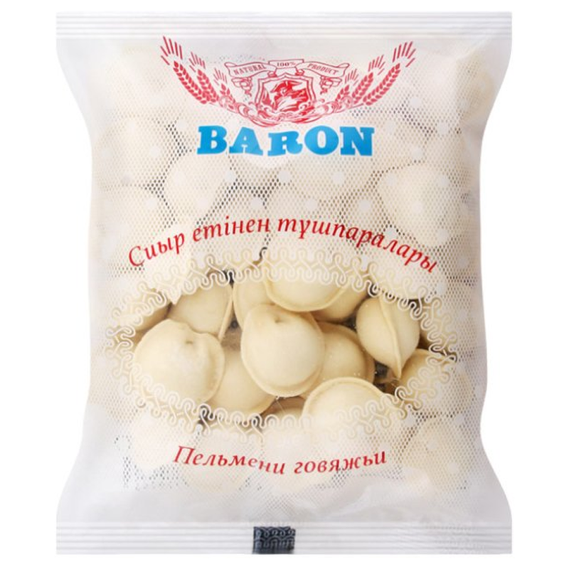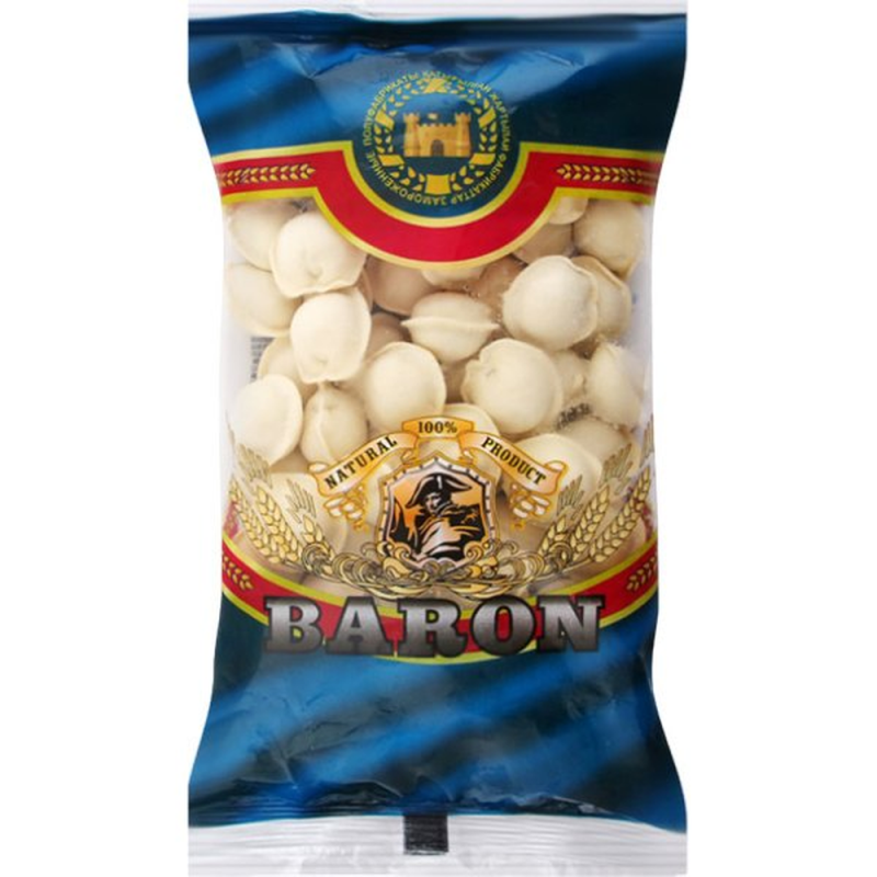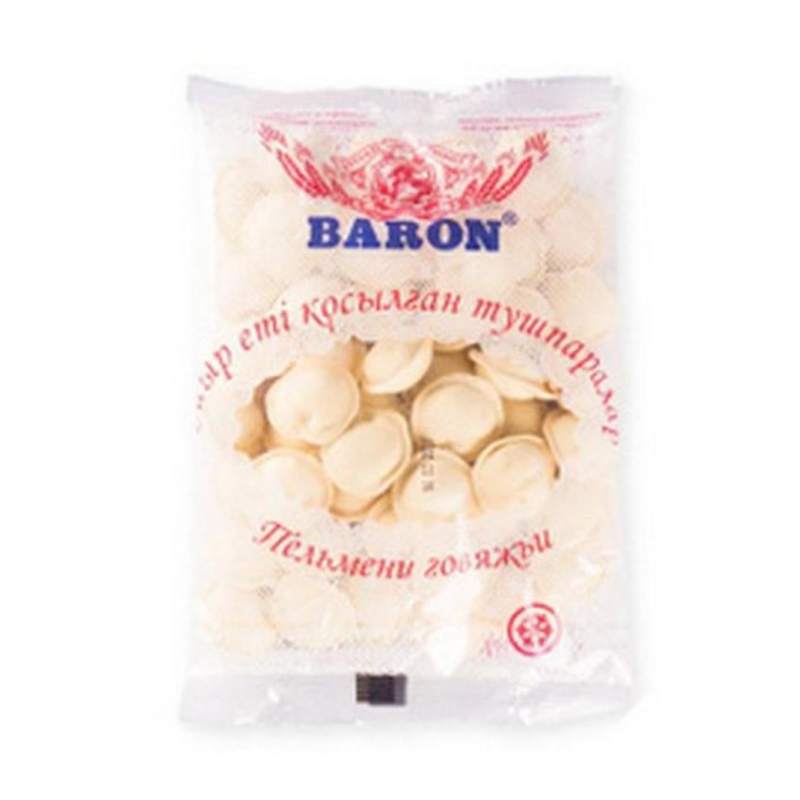 Пельмени Baron говяжьи премиум (400 г): Говяжие пельмени премиум обычно представляют собой высококачественное блюдо, где начинка состоит из говядины и различных специй, завернутых в тонкое тесто. Возможный состав включает муку, говядину, лук, соль, перец и другие специи.