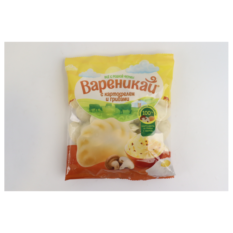 Вареники Вареникай с картофелем и грибами весом 350 г аммов - это вариация традиционных вареников с добавлением грибов к картофельной начинке. Тесто обычно состоит из муки, воды, яиц, а начинка может включать картофель, грибы и другие ингредиенты по рецепту.