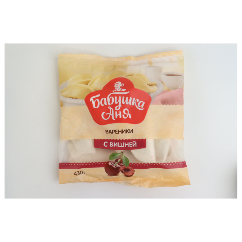 Вареники с вишней «Бабушка Аня» весом 430 г аммов - это типичные вареники с начинкой из вишни, завернутые в тонкое тесто. Возможный состав включает муку, воду, яйца и вишню, возможно с добавлением сахара или других ингредиентов.