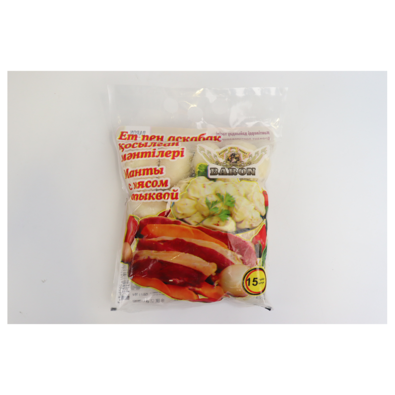 Манты Baron с мясом/тыквой (700 г): Манты Baron - это традиционное блюдо в удобной упаковке весом 700 г амм, приготовленное из тонкого теста, начиненного сочным мясом и ароматной тыквой. Возможный состав включает муку, мясо (чаще всего говядина или баранина), тыкву, лук и специи, создавая неповторимый вкус.