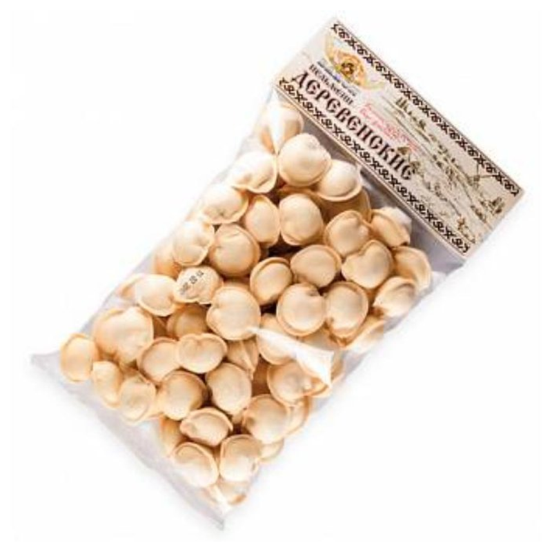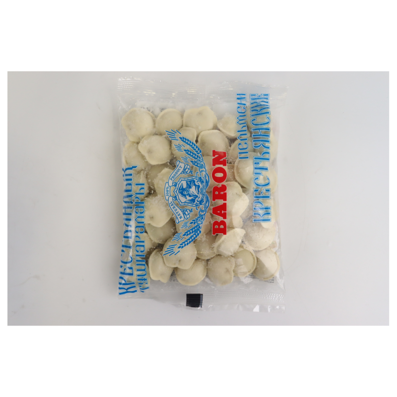 Пельмени Baron деревенские (700 г): Пельмени Baron весом 700 г амм - это классическое домашнее блюдо, представленное в удобной упаковке. Деревенские пельмени обычно содержат начинку из смеси мелко нарезанного говядины или свинины с луком и специями, завернутую в тонкое тесто. Возможный состав включает муку, мясо, лук, соль, перец и другие специи.