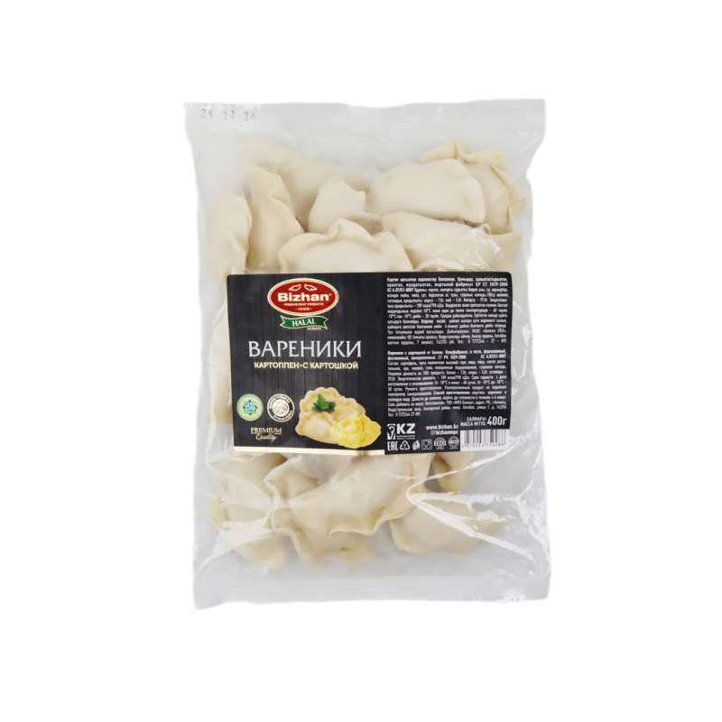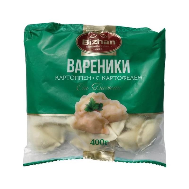 Вареники «Бижан» мини с картошкой (400 г): Эти мини-вареники обычно изготавливаются из мягкого теста, наполненного картошкой. Иногда содержат лук или специи для добавления вкуса. Состав может включать муку, картошку, соль, воду, возможно лук или другие добавки, в зависимости от рецептуры.