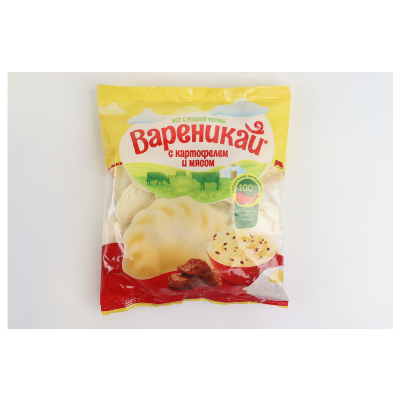 Вареники Вареникай с картофелем и мясом весом 350 г аммов - это вариация традиционных вареников с добавлением мяса к картофельной начинке. Тесто обычно состоит из муки, воды, яиц, а начинка может включать картофель, мясо и другие ингредиенты по рецепту.