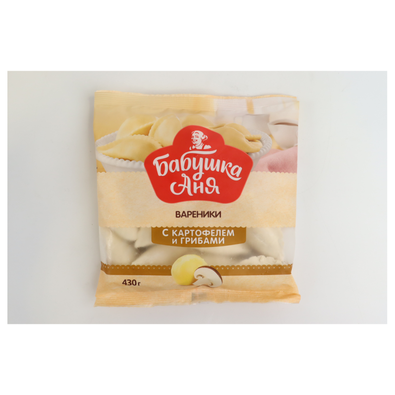 Вареники с картофелем/грибами «Бабушка Аня» весом 430 г аммов - это вареники с начинкой из картофеля и грибов, завернутые в тонкое тесто. Обычно состав может включать муку, воду, яйца, картофель, грибы и другие ингредиенты.